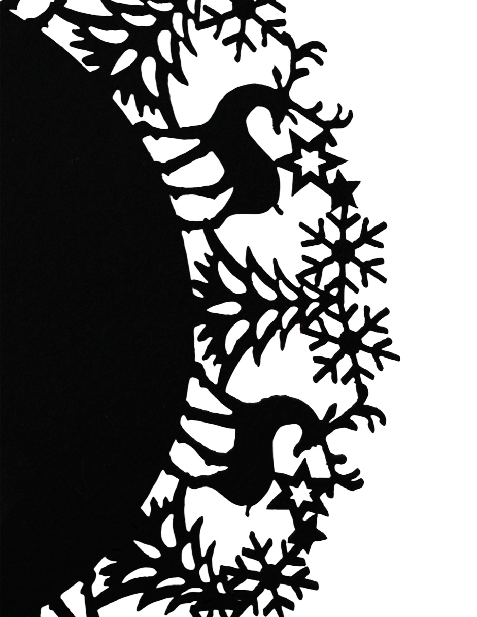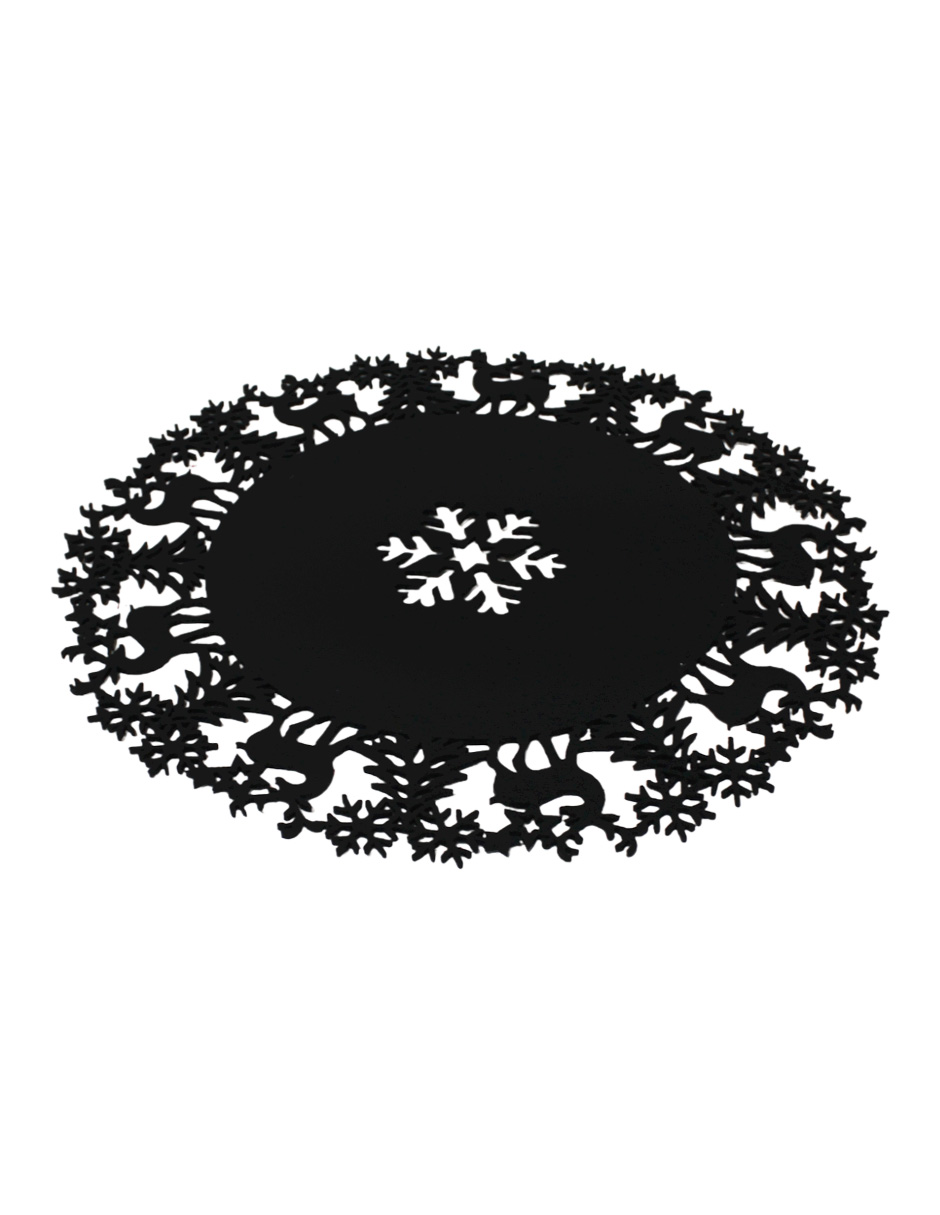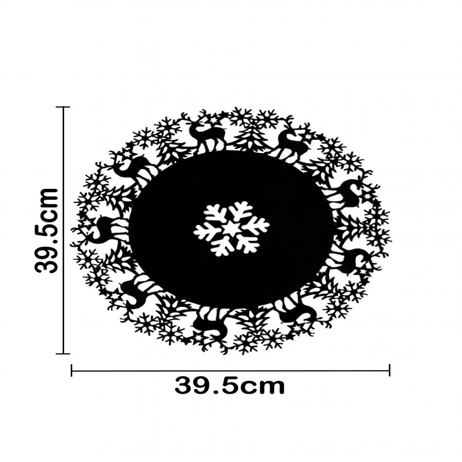 Un elegante mantel de fieltro negro con ciervos y copos navideños, con medidas de 40x40x0.3 cm. Ideal para un toque de lujo y modernidad.