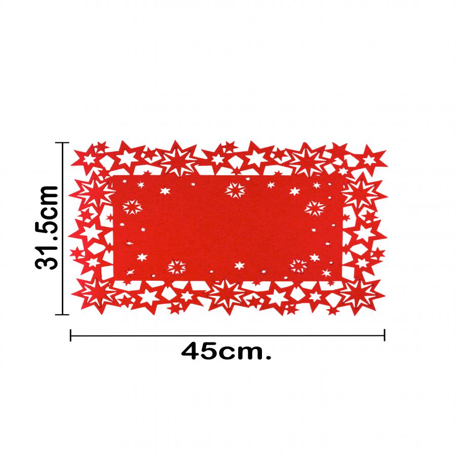 Un festivo mantel de fieltro rojo con un diseño de estrellas, con medidas de 45x33x0.3 cm. Ideal para proteger tus superficies con un toque de color y alegría.