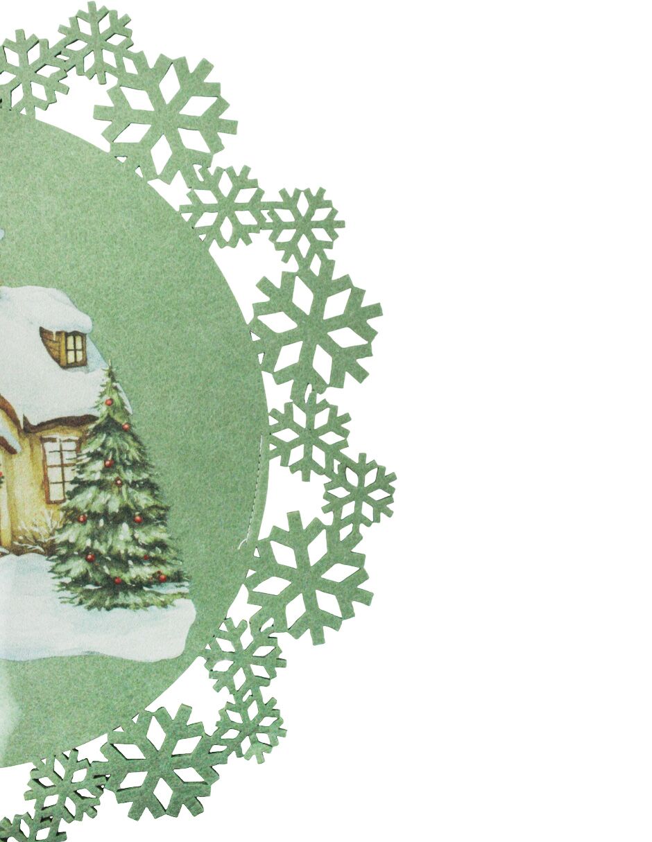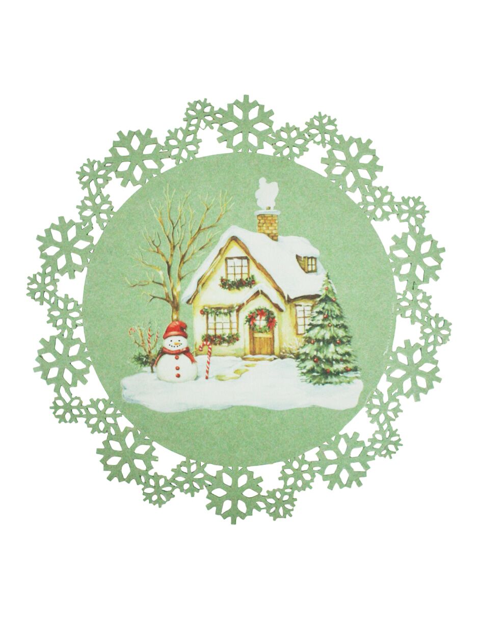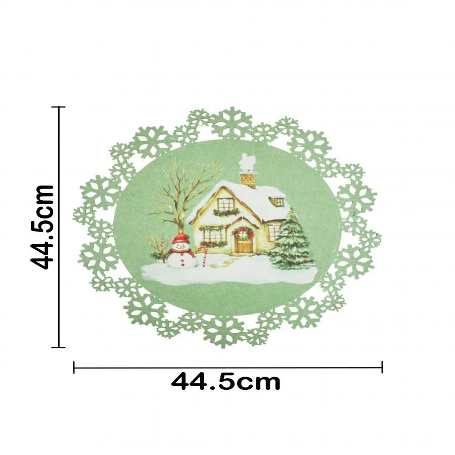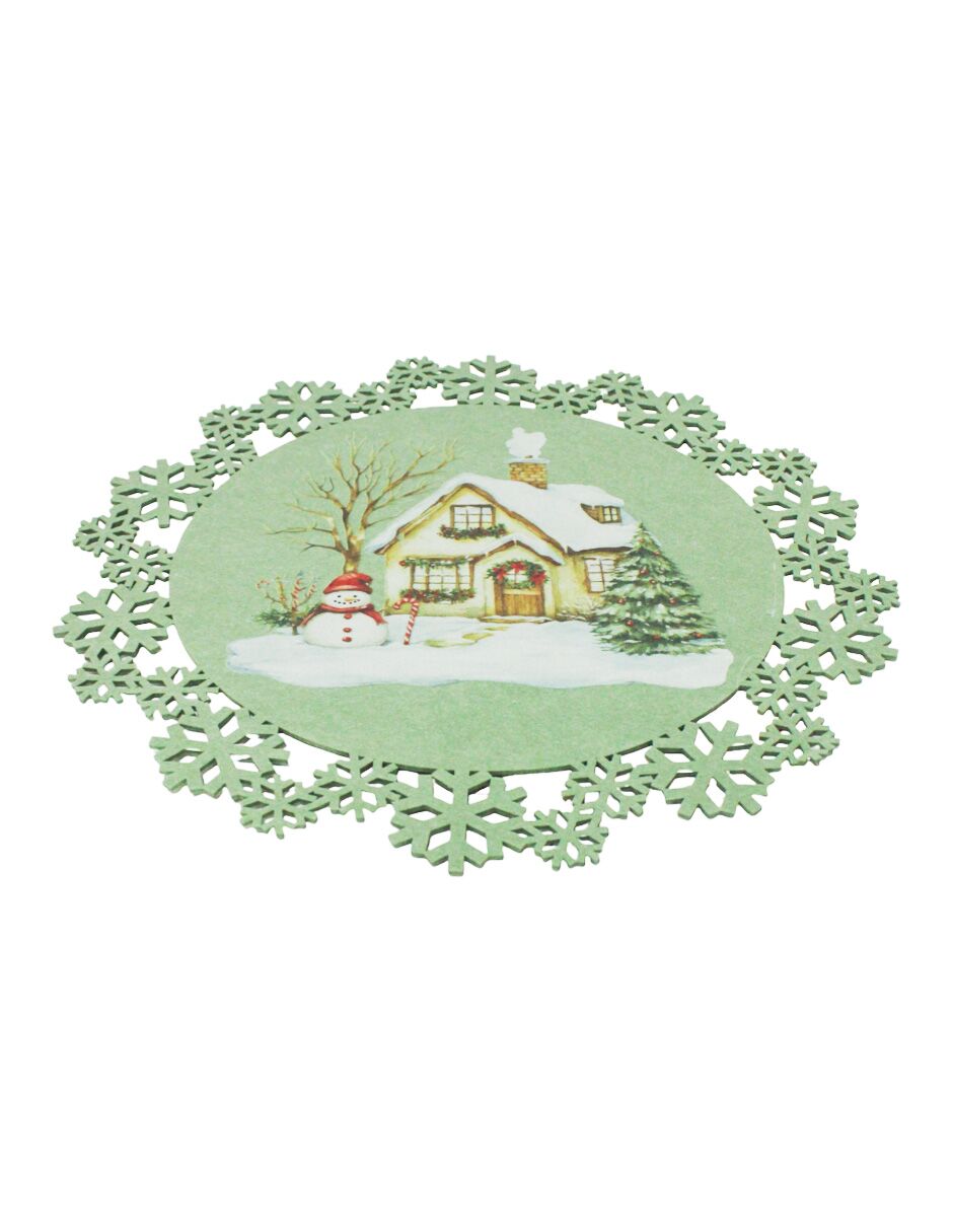 Un festivo mantel redondo de fieltro verde con un diseño de muñeco de nieve, con medidas de 45×45 cm. Ideal para proteger tus superficies con un toque de fantasía y alegría.