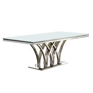 Mesa de acero inoxidable con cubierta de cristal templado blanco con base cromada de 200x100x75cm