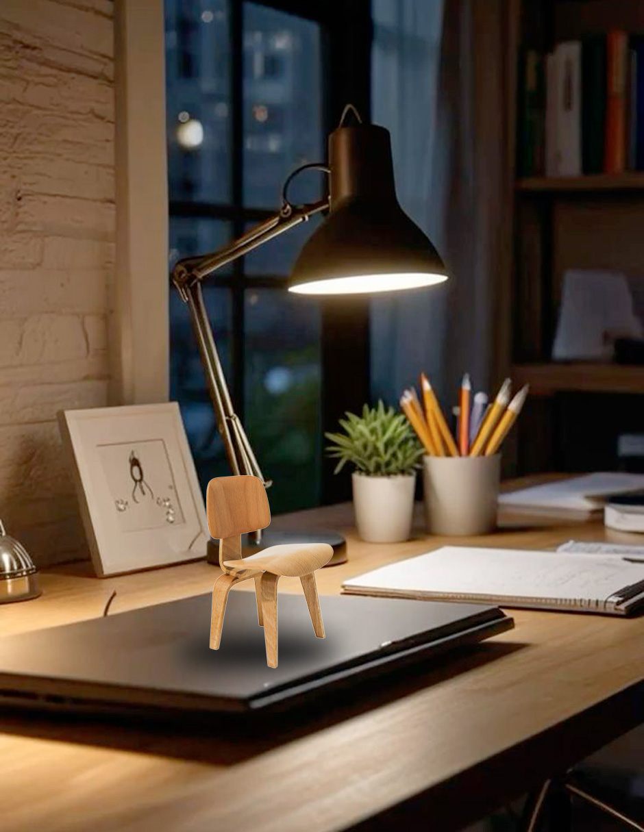 Un toque de elegancia y funcionalidad en miniatura. Esta mini silla Eames de madera natural es la pieza perfecta para un escritorio o mesa de noche. Con sus medidas de 7.5×8.5x13cm, su diseño único evoca la sofisticación y el estilo moderno.