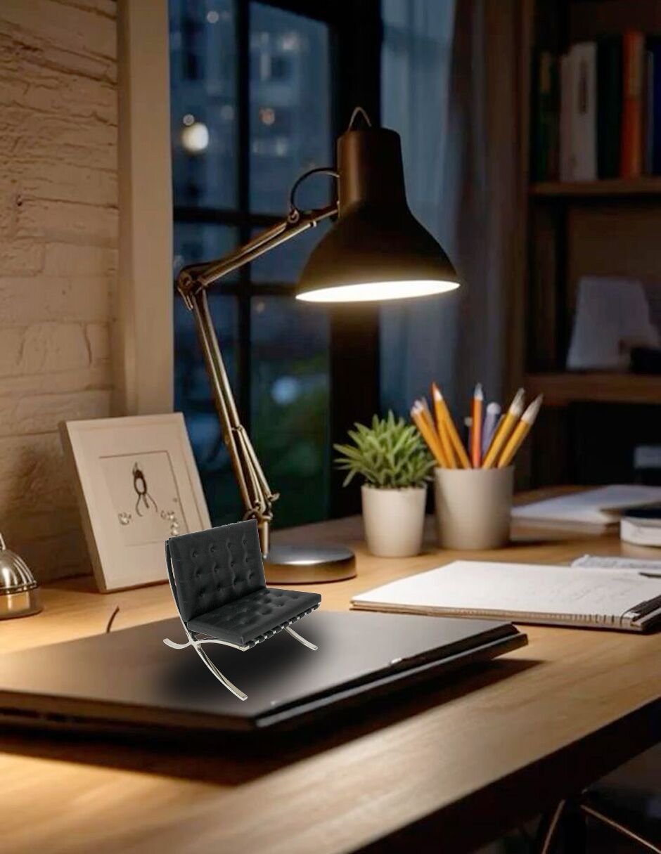 Calidad y Resistencia en la Mini Silla Lounge en Vinil Negra Lo que define a este modelo es su fabricación con materiales de lujo. La estructura de la Mini Silla Lounge en Vinil Negra ha sido cuidada para ofrecer una textura premium y una forma impecable. De este modo, cada ángulo de la pieza refleja una estética de alta fidelidad y un gusto refinado. Además, el acabado en vinil negro es sumamente elegante y fácil de integrar en ambientes profesionales. También cuenta con una base sólida que asegura su estabilidad y presencia. Sin duda, es un accesorio diseñado para perdurar como un elemento clave en tu repisa o escritorio de oficina.