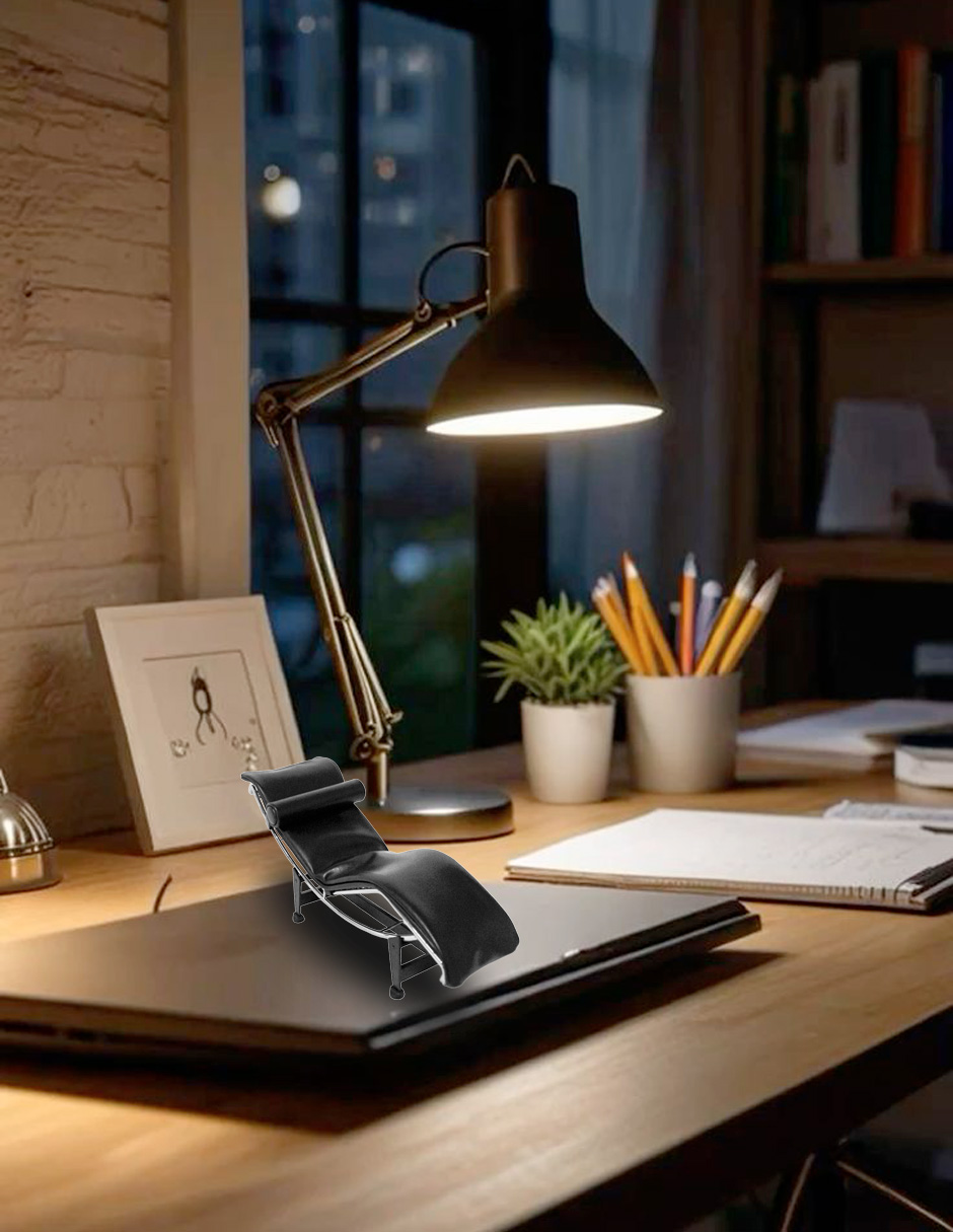 Un toque de elegancia y funcionalidad en miniatura. Esta mini tumbona de vinil negro es la pieza perfecta para un escritorio o mesa de noche. Con sus medidas de 9.5x30x10.5cm, su diseño único evoca la sofisticación y el estilo moderno.