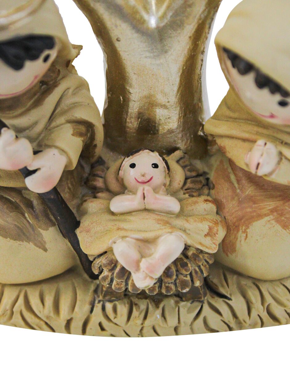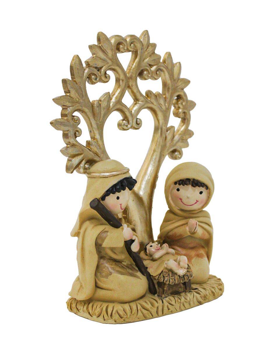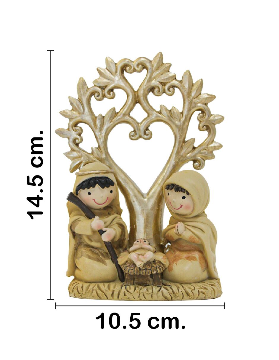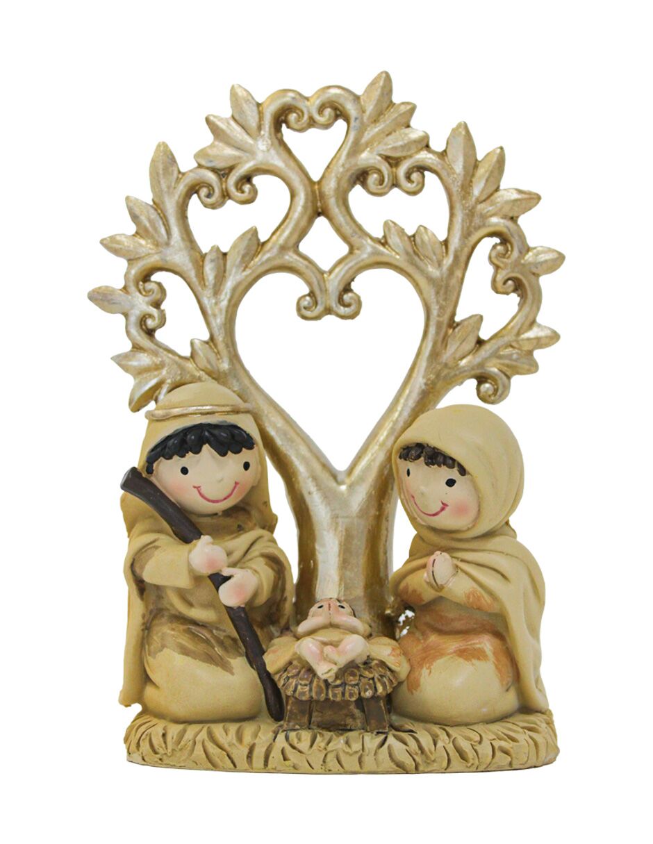 Nacimiento con un toque moderno y romántico, dispuesto sobre una base que incluye un árbol decorado con un diseño de corazones. La pieza, de poliresina, celebra el amor y la alegría que trae la Navidad.