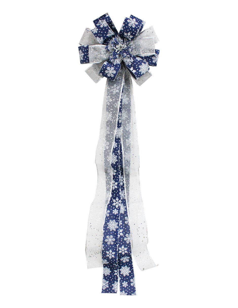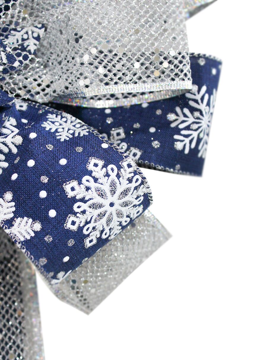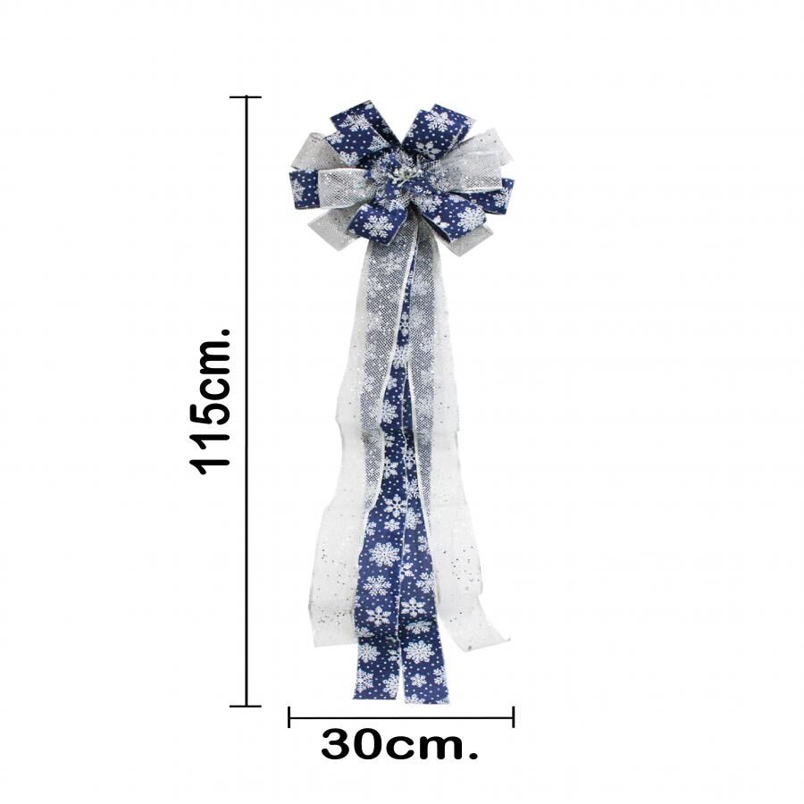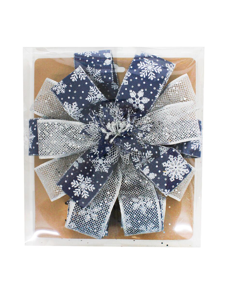 Un elegante moño navideño de lino en color azul marino con una sofisticada malla plateada. Es la pieza perfecta para añadir un toque de lujo y modernidad a tu decoración festiva. Su diseño versátil es ideal para adornar coronas, guirnaldas o el árbol de Navidad, creando un ambiente distinguido y lleno de estilo.