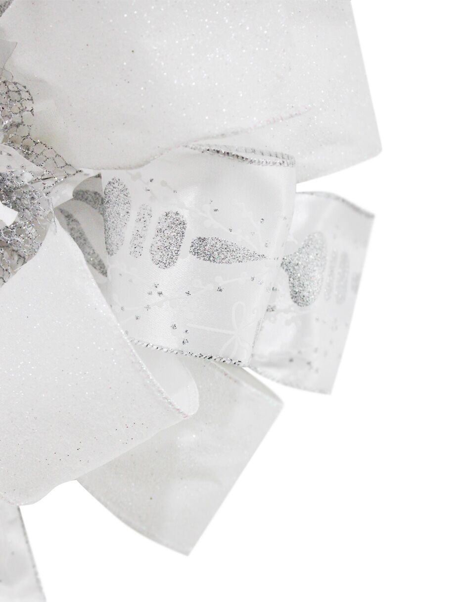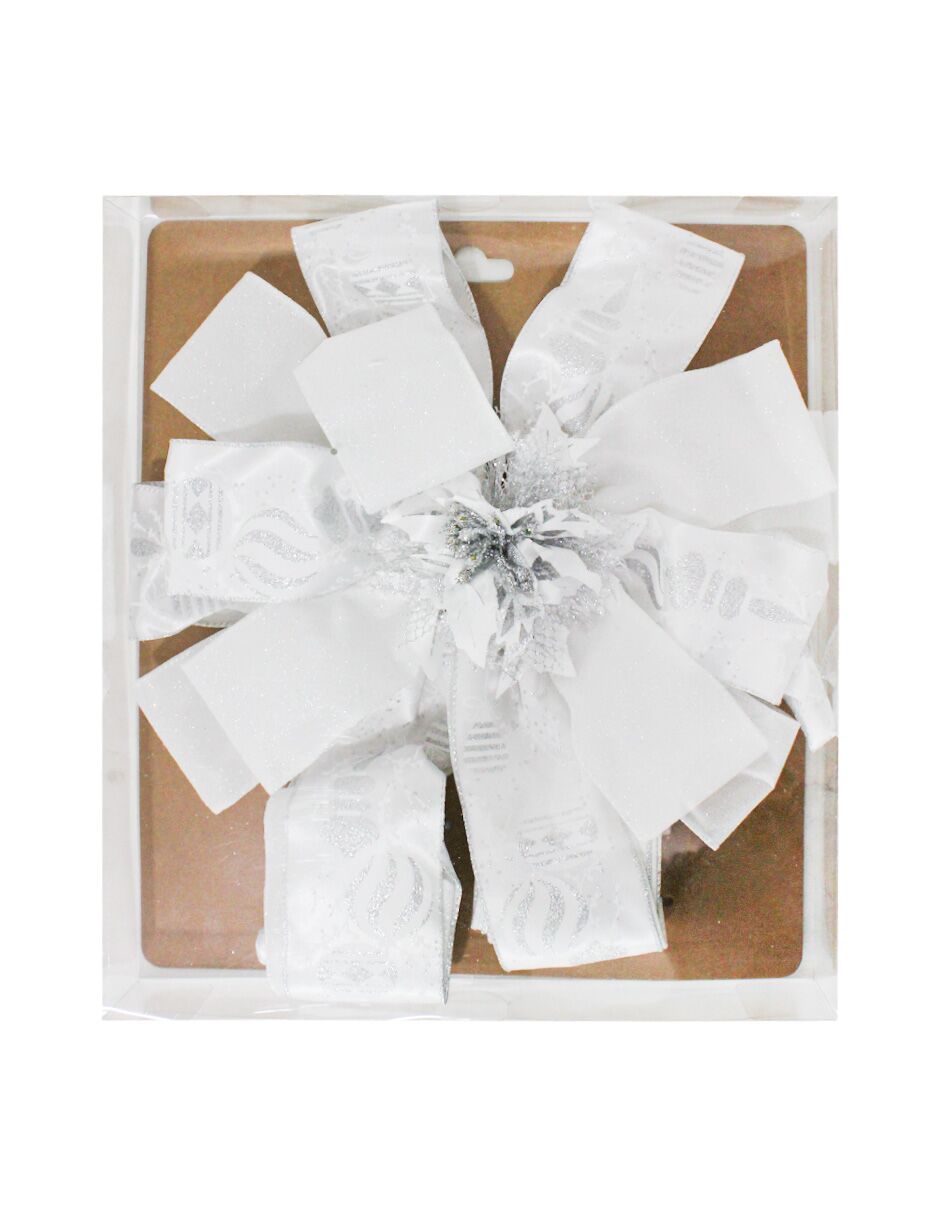 Un elegante moño navideño de satín en color blanco con un estampado festivo en tonos plateados y dorados. Su textura suave y su brillo sutil añaden un toque de lujo y sofisticación a tu decoración festiva. Es una pieza versátil y perfecta para decorar tu árbol de Navidad, guirnaldas o regalos.