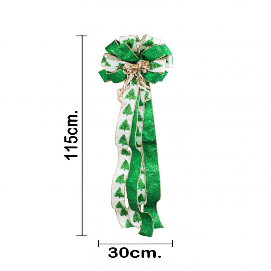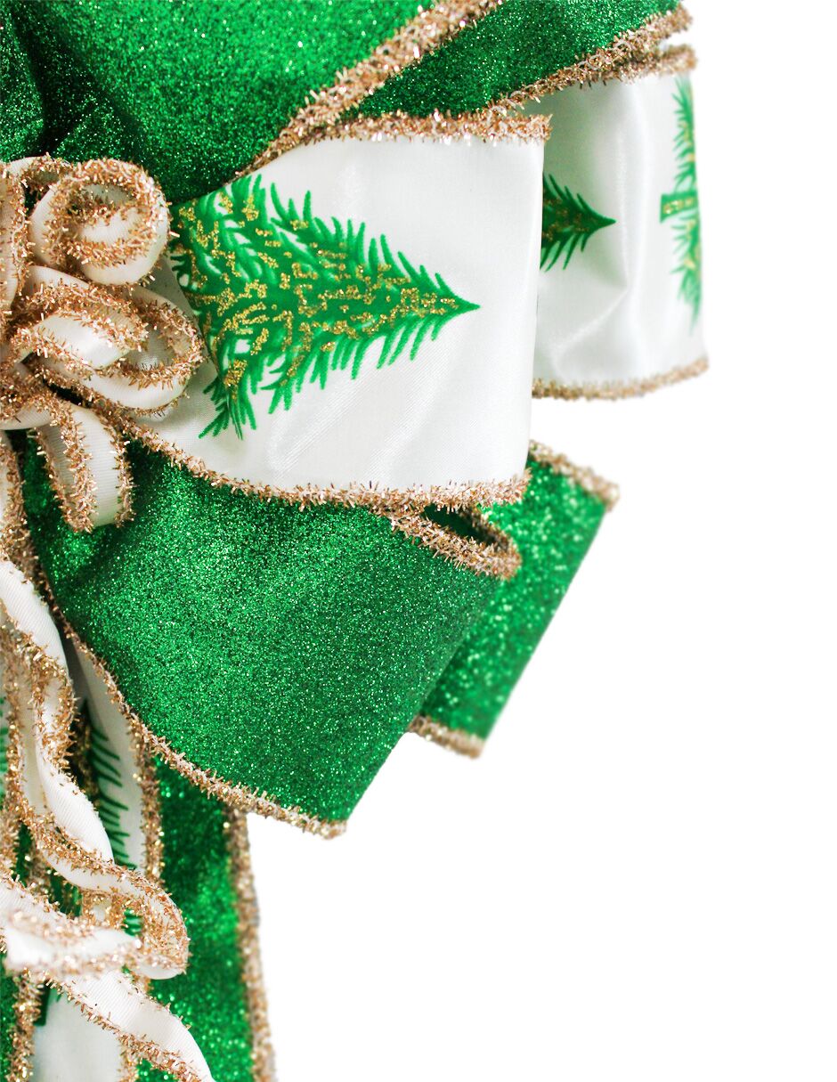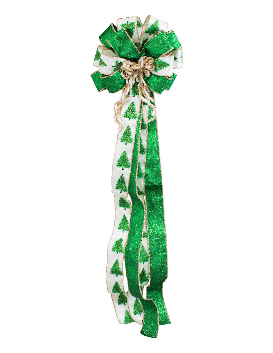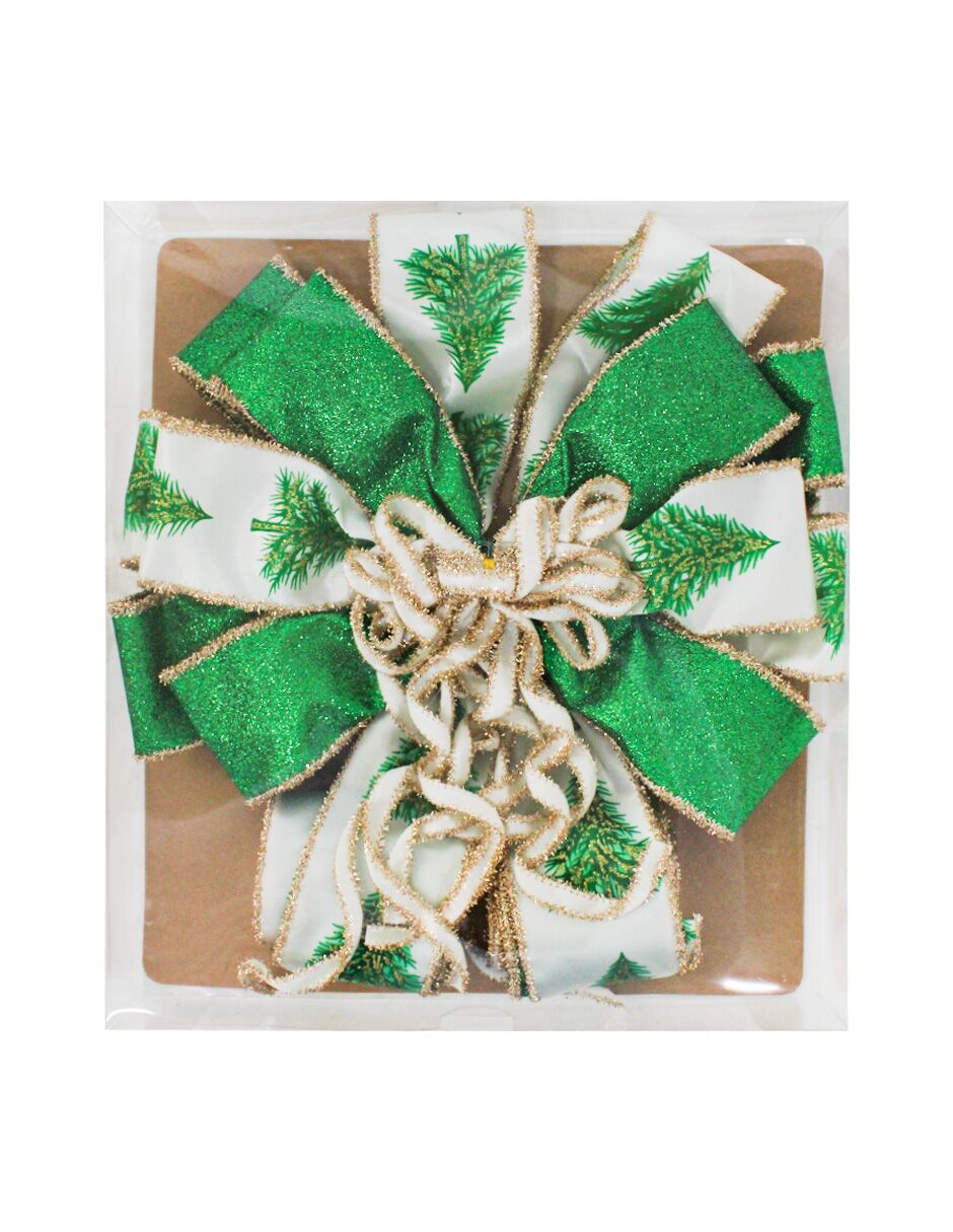 Un festivo moño navideño de satín en color verde con un acabado diamantado y un estampado de pinos. Su diseño combina la tradición con un toque de brillo, siendo el accesorio perfecto para tu decoración. Es una pieza versátil y encantadora, ideal para decorar tu árbol, guirnaldas o coronas.
