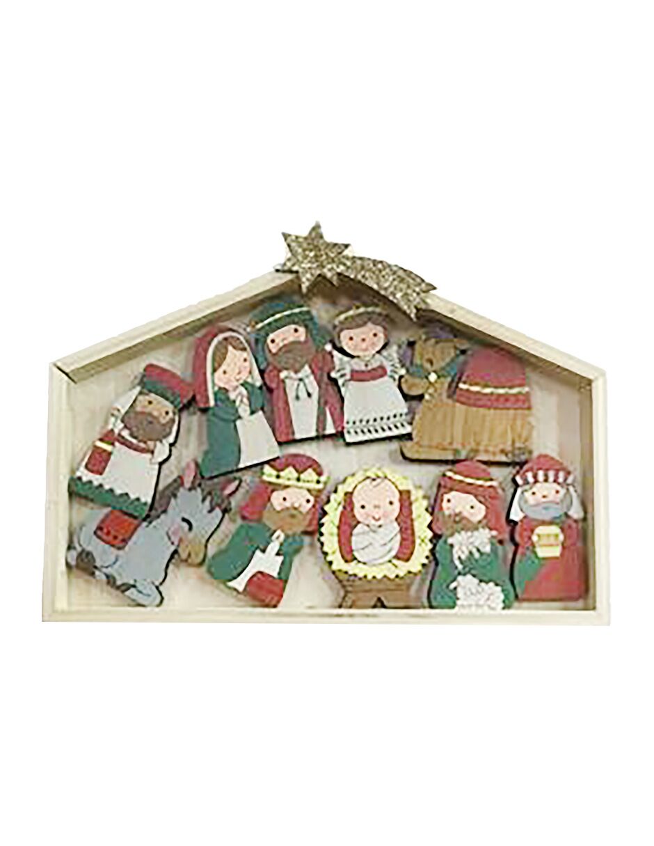 Encantadora Casa de madera en color rojo que alberga un Nacimiento completo en su interior. Es una pieza compacta y lista para exhibir, que evoca la calidez de un hogar festivo. Material: madera. Medidas: 16 x 22 x 2 cm.