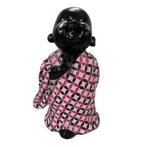 Niño buda de resina sonriendo con traje rosa con blanco de 20cm