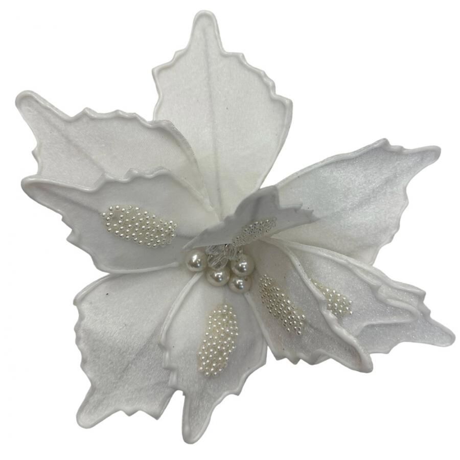 Flor Nochebuena Terciopelo Blanco con Perlas