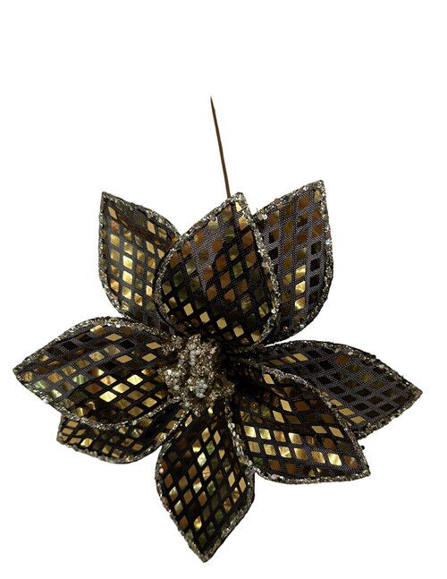 Celebra la temporada con un estilo otoñal y un brillo moderno con esta impresionante flor de Nochebuena. Su diseño en mosaico con un elegante tono café y acabado glitter se aparta de lo tradicional, creando un acento visual creativo y sofisticado. Es la pieza perfecta para inyectar distinción, originalidad y un ambiente lleno de calidez a tus arreglos navideños. Material: Tela con Glitter. Medidas: 25 x 45 x 0.1 cm.