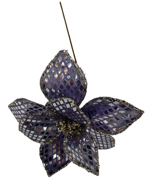Celebra la temporada con un estilo vibrante y un brillo moderno con esta impresionante flor de Nochebuena. Su diseño en mosaico con un audaz tono morado y acabado glitter se aparta de lo tradicional, creando un acento visual creativo y sofisticado. Es la pieza perfecta para inyectar distinción, originalidad y un ambiente lleno de fantasía a tus arreglos navideños. Material: Tela con Glitter. Medidas: 25 x 45 x 0.1 cm.