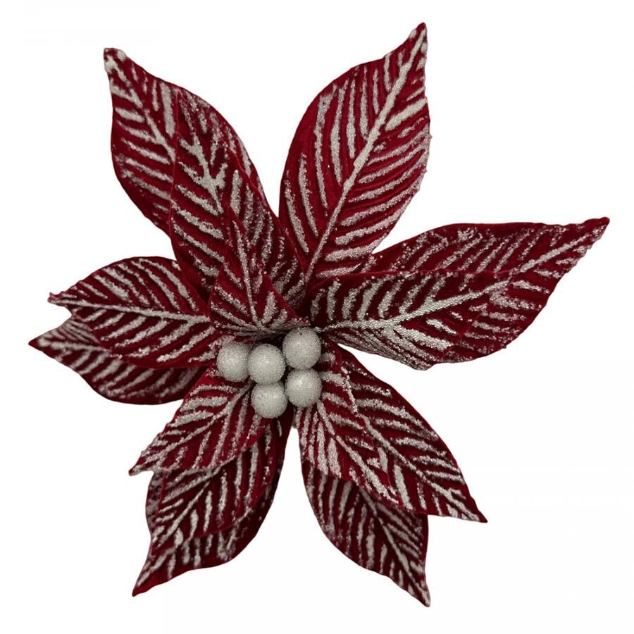 Celebra la temporada con la belleza clásica y el toque invernal de esta impresionante flor de Nochebuena. Su diseño en rojo vibrante, con delicados pliegues y un sutil efecto nevado, adornado con bayas blancas, evoca un lujo tradicional, ideal para inyectar calidez, distinción y el auténtico espíritu navideño a tus árboles, guirnaldas o centros de mesa. Es el acento perfecto para crear una atmósfera acogedora y sofisticada. Material: Tela y Plástico. Medidas: 25 x 25 x 0.1 cm.