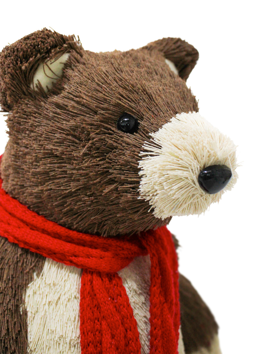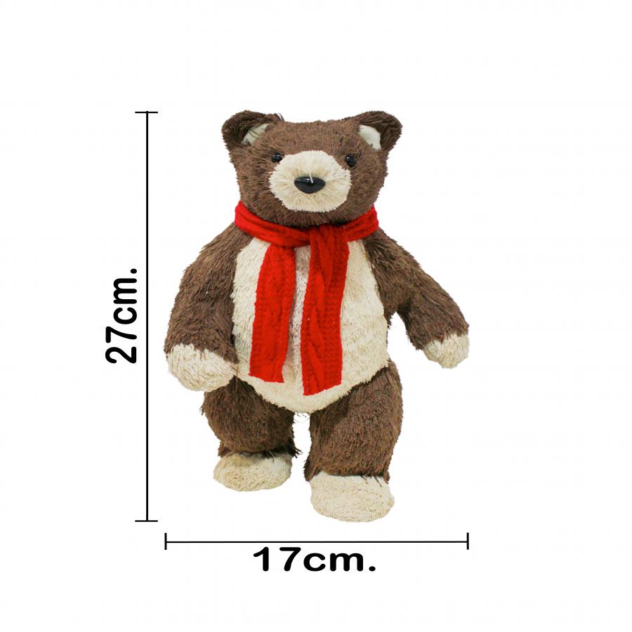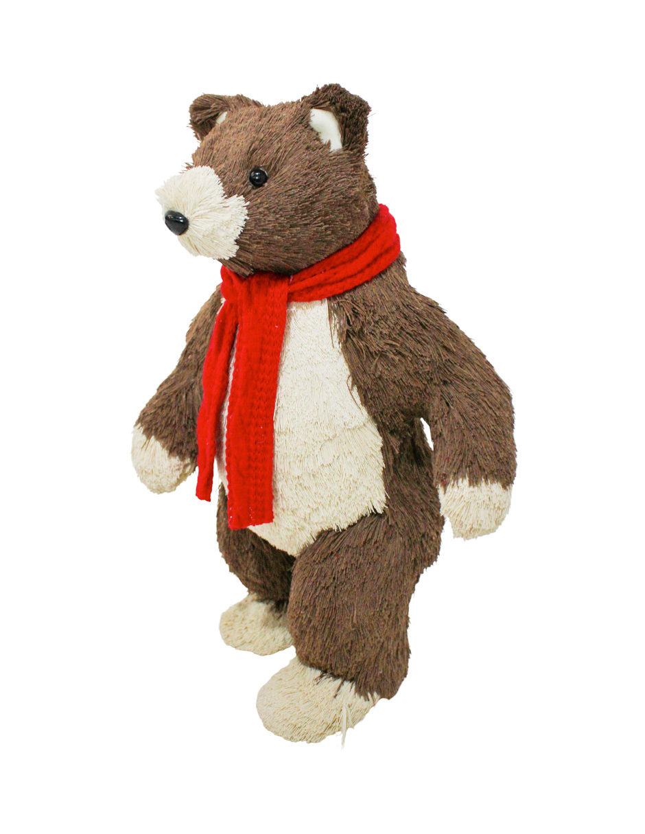 Oso de fibras café de pie con bufanda roja de 16x14x29cm