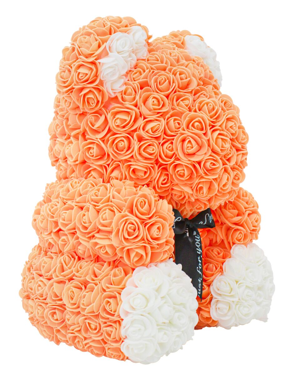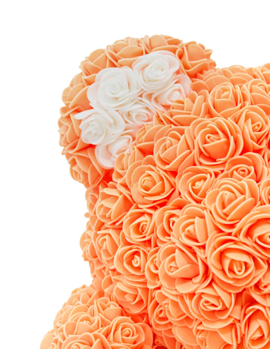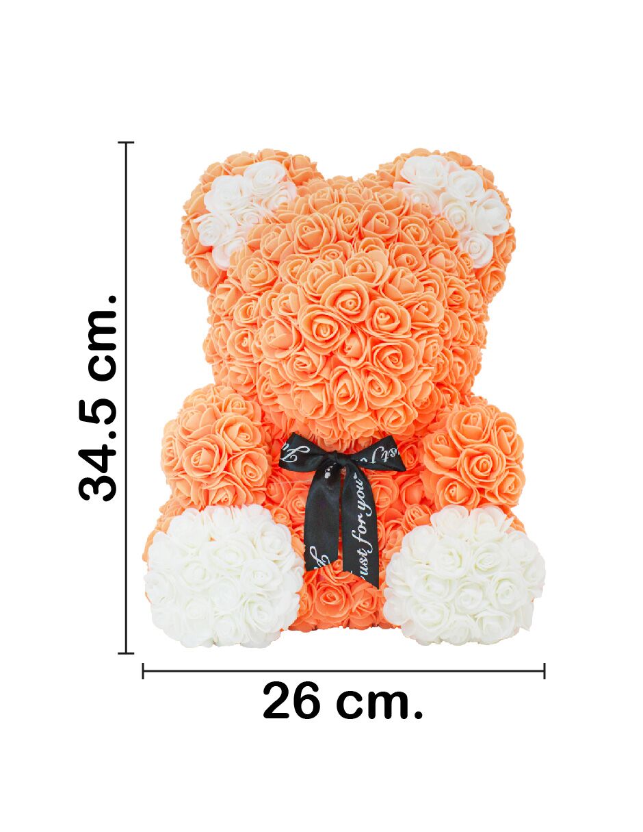 Encantadora figura decorativa con la forma de un oso, cubierta enteramente de pequeñas rosas de fomi (foam) en un suave y elegante color naranja melocotón. Cuenta con detalles blancos en las orejas y patas, e incluye un lazo de regalo negro con el texto “Just for you” (“Solo para ti”). Es el regalo perfecto para expresar ternura y afecto. v
