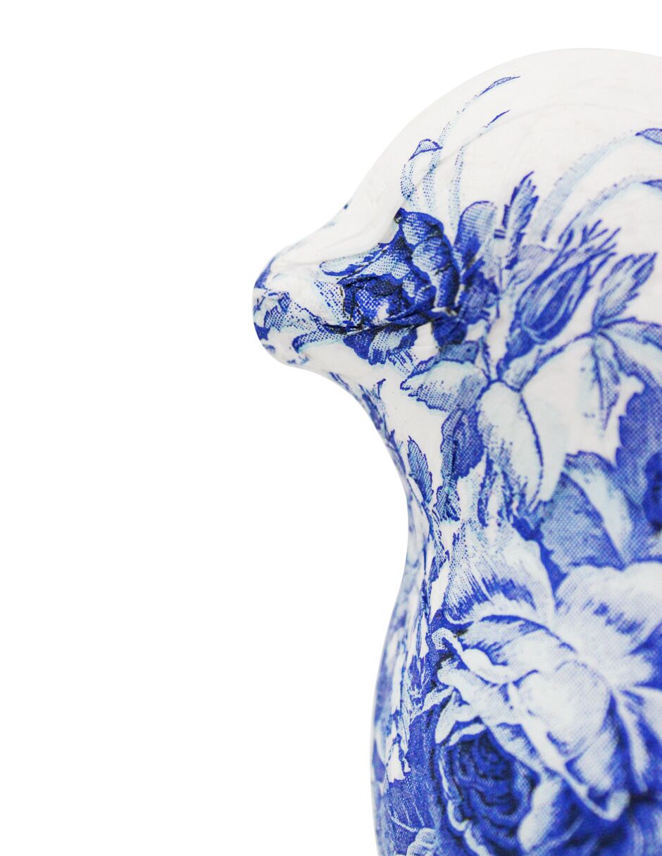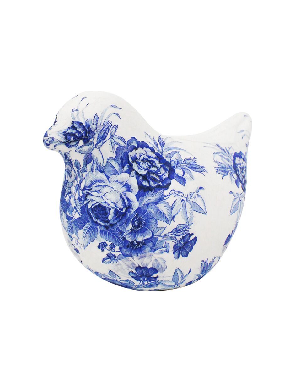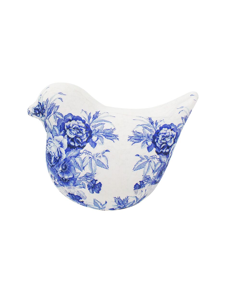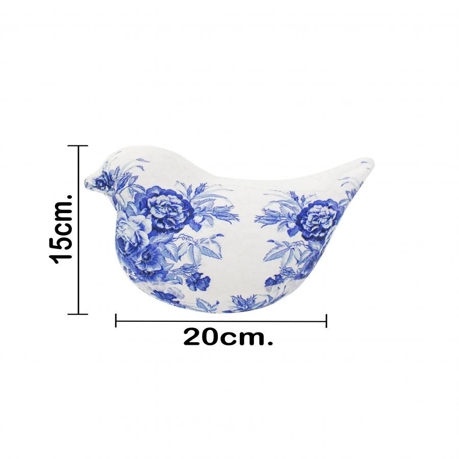 Pajaro forrado de papel con flores azul con blanco de 20x13x15cm
