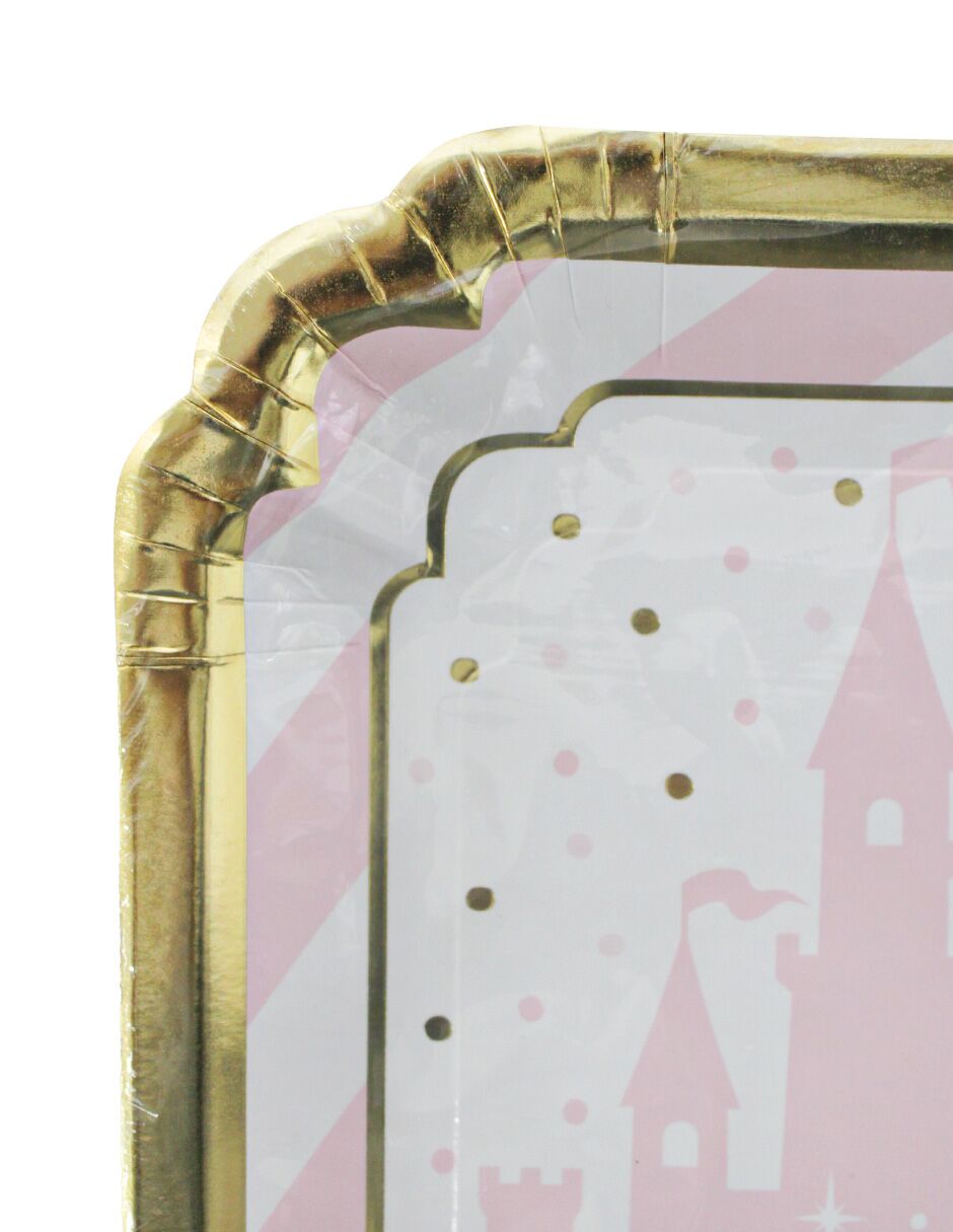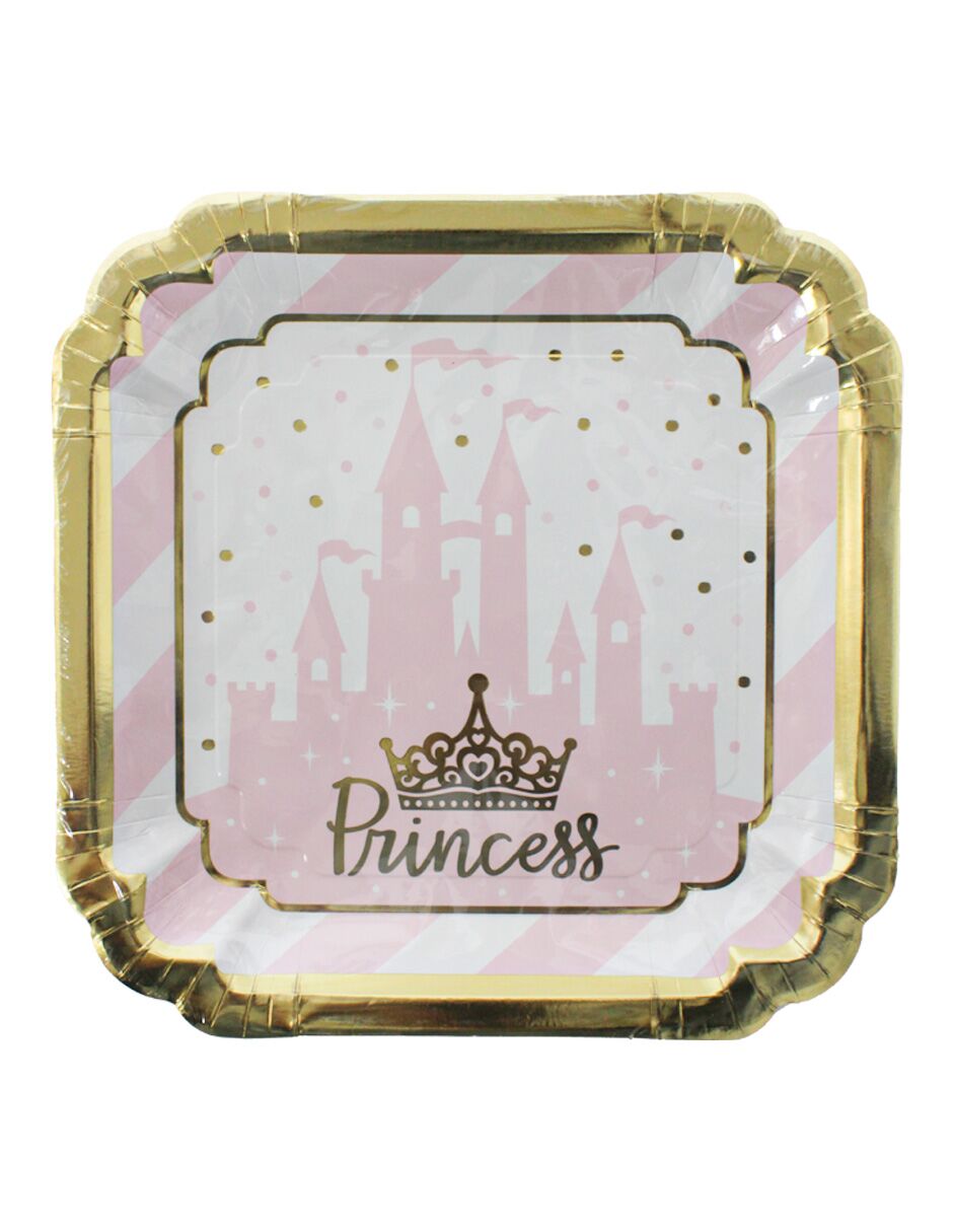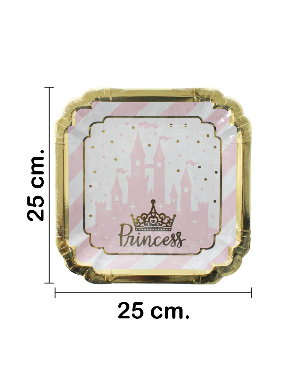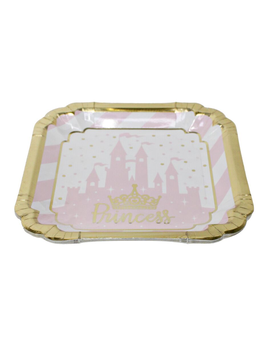 Paquete de 8 platos cuadrados desechables diseño castillo rosa de25x25x1.8 cm