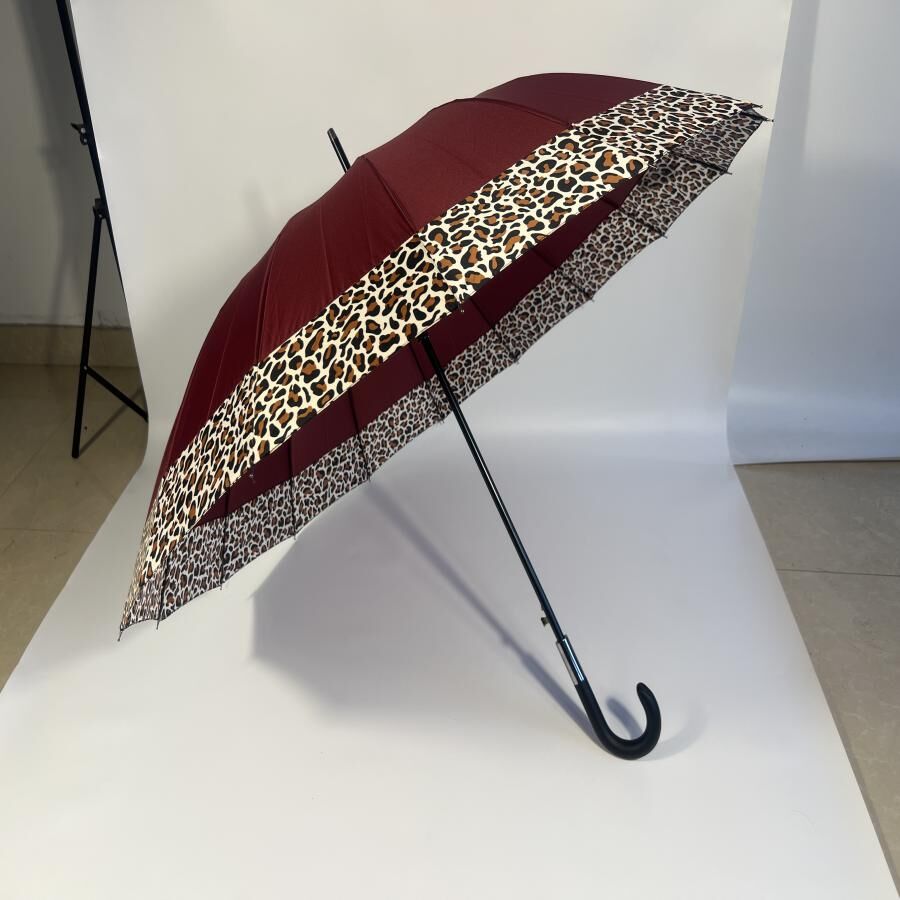 Este paraguas de bastón presenta un llamativo diseño de tela roja con un patrón de animal print en el borde. La estructura interna está fabricada con fibra de vidrio, lo que le aporta ligereza y resistencia. Cuenta con un mango de plástico curvado de color negro que facilita un agarre cómodo y seguro. Es un accesorio funcional y con estilo para protegerse de la lluvia.