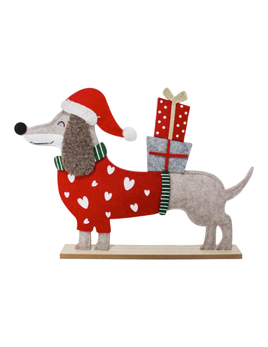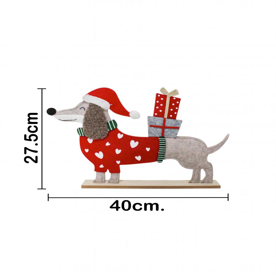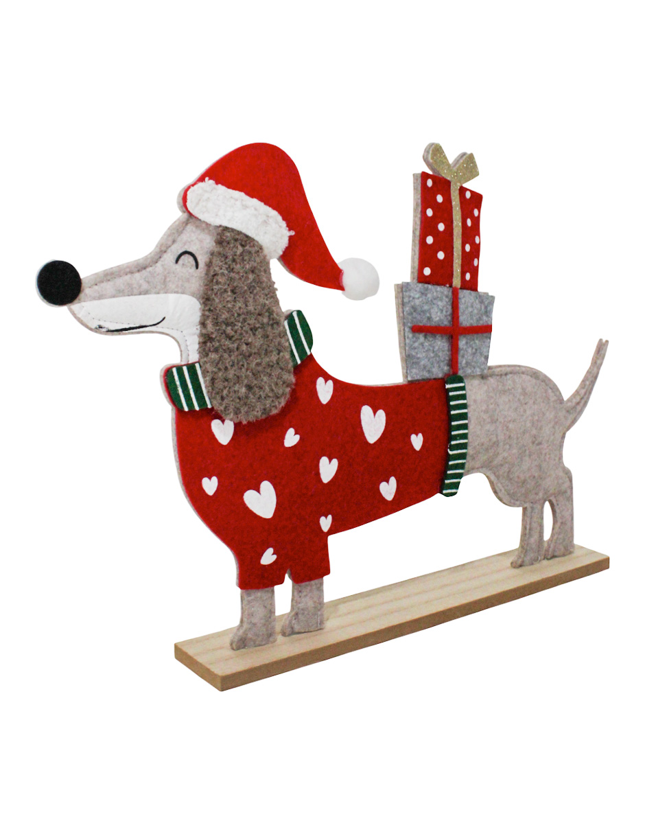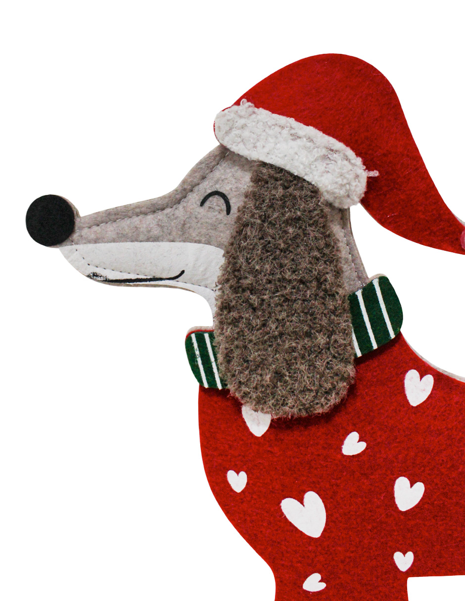 Un tierno perro de tela con un suéter rojo con diseño de corazones, con medidas de 39x5x28 cm. Ideal para añadir un toque de dulzura y amor.