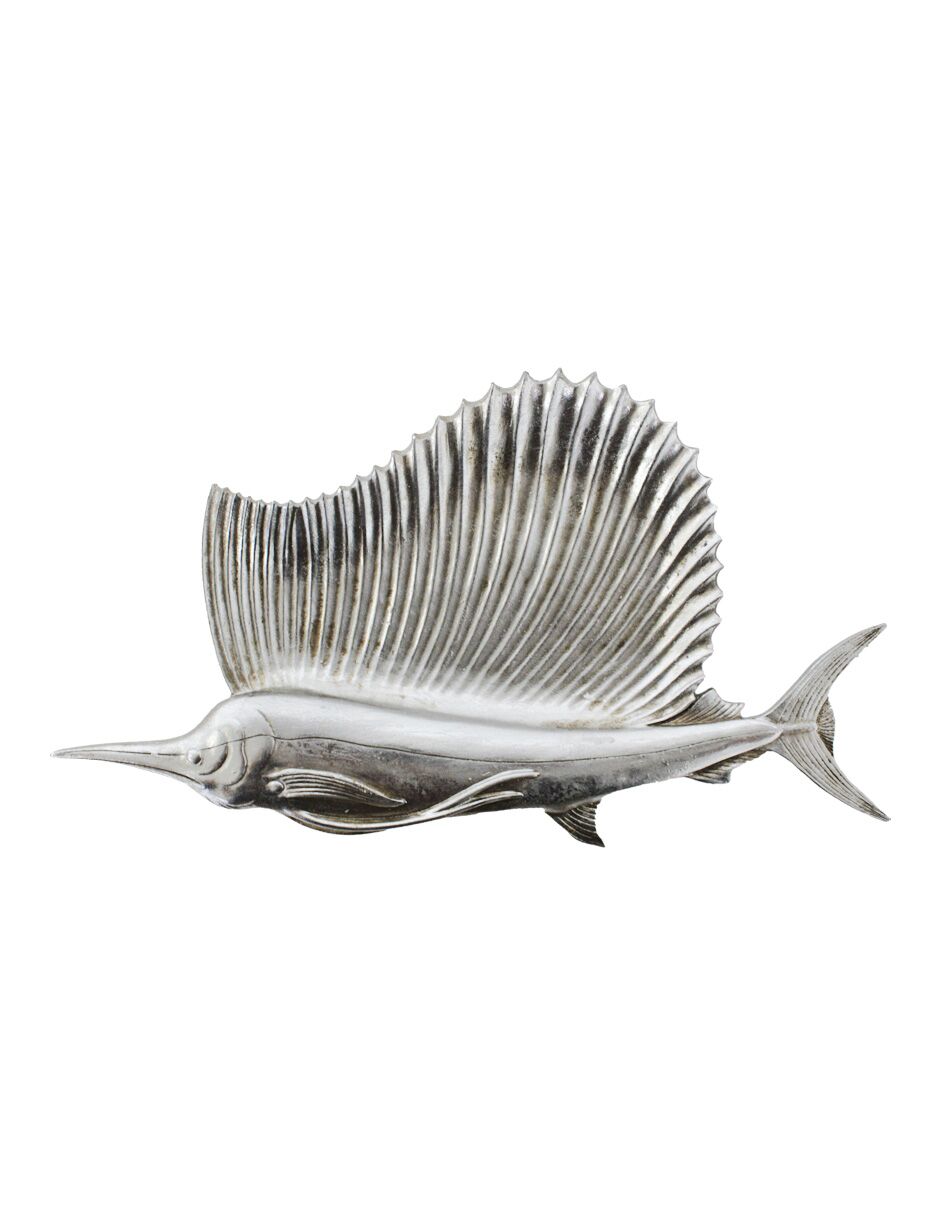 Figura decorativa de un Pez Espada con un acabado plateado brillante. Perfecta como pieza central en un ambiente marino o moderno. El material es poliresina. Medidas: 35 x 20 x 2.5 cm.