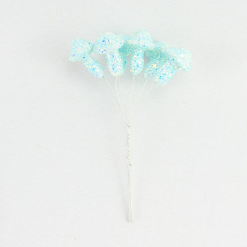 Un mágico pick de 6 hongos diamantados en color azul claro. Es ideal para dar un toque de fantasía y brillo a tus arreglos florales y decoraciones, llenando cualquier espacio de un estilo único y festivo. Material: plástico. Medidas: 7 x 12 x 3 cm.