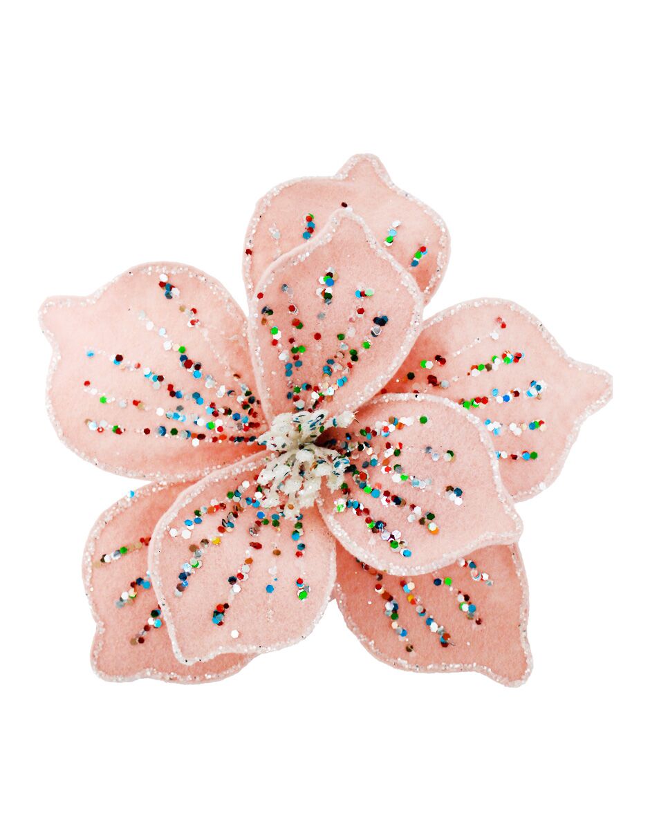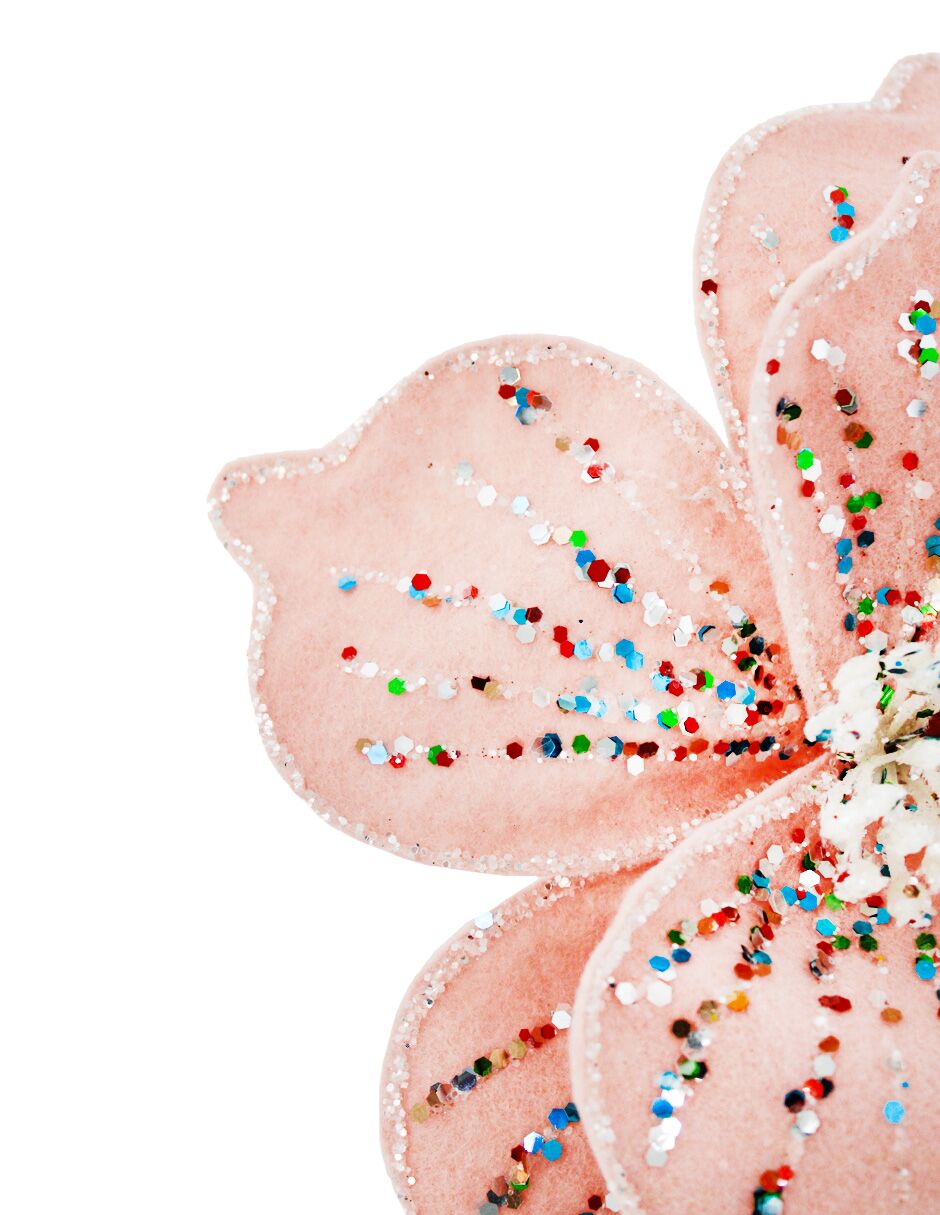 Un elegante pick de nochebuena de terciopelo color durazno con diamantina. Es ideal para dar un toque de brillo y sofisticación a tus arreglos florales, llenando cualquier espacio de un estilo único. Material: terciopelo. Medidas: 22 cm.