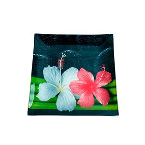 Por consiguiente, su diseño es excepcionalmente audaz y artístico. El plato, de forma cuadrada moderna, presenta un vibrante estampado de dos flores grandes (dalias/hibiscos), una de color blanco puro y otra de color rojo intenso, contrastando con un fondo negro/verde oscuro con detalles de cañas de bambú en la parte inferior. Además, este patrón simboliza la belleza efímera de las flores tropicales y la conexión con la naturaleza exótica. De igual forma, la forma cuadrada le confiere un aire contemporáneo que equilibra la riqueza del estampado. El plato está fabricado en Cristal de alta calidad con un acabado brillante y liso. En consecuencia, esta pieza es ideal como plato de postre, plato para servir aperitivos o como bandeja decorativa para agregar un acento tropical y audaz a cualquier espacio.