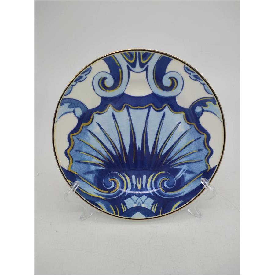 Plato pequeño que evoca la delicadeza del fondo marino. Presenta un elegante diseño marino con detalles en dorado sobre fondo azul. Ideal para postres o aperitivos, esta pieza de cerámica aporta un toque lujoso y temático a tu vajilla. Medidas: 19.5 cm (diámetro).