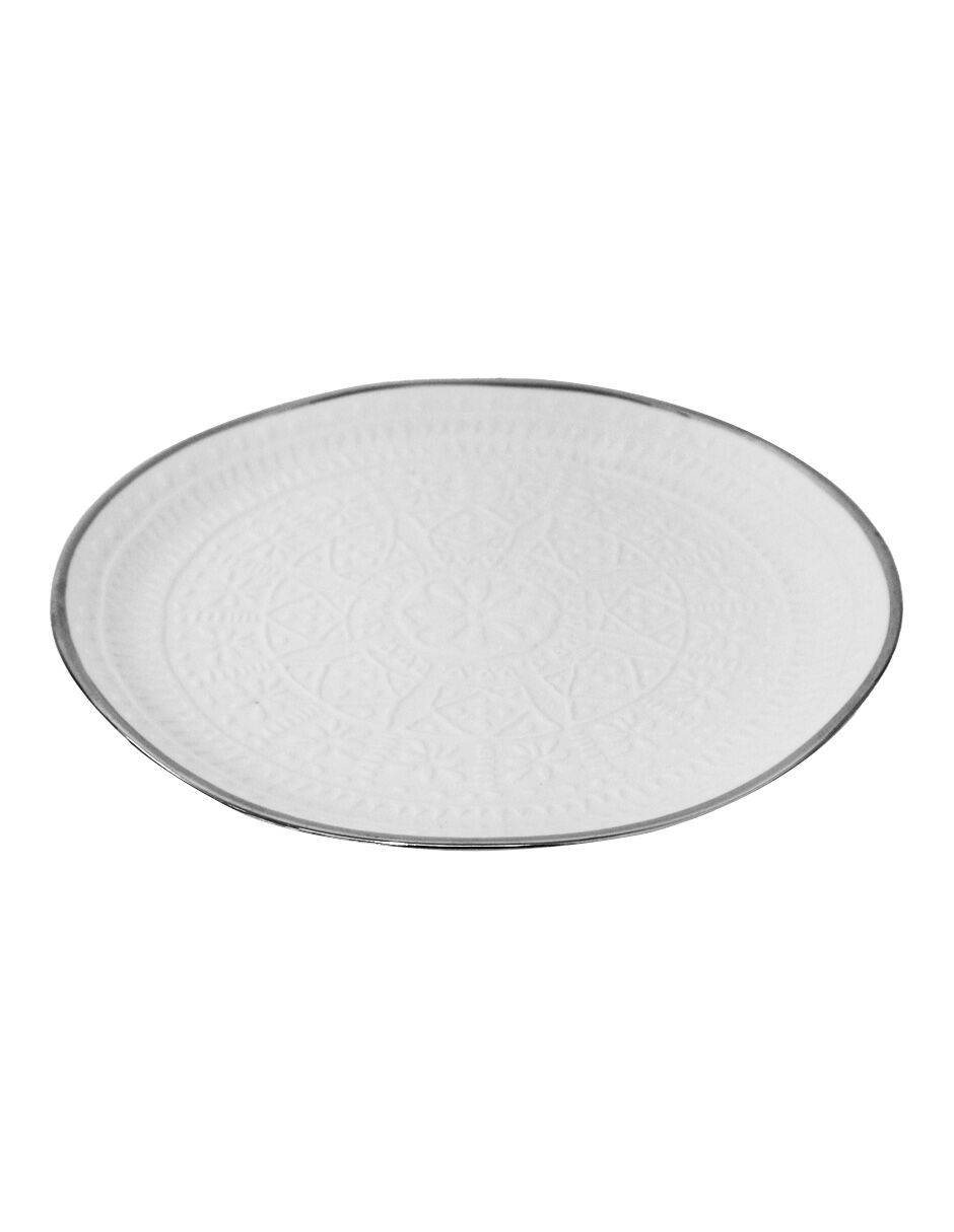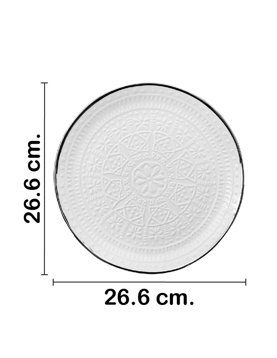 Sirve tus platillos con un toque de elegancia y estilo con este plato de cerámica blanca. Su sutil relieve y orilla plateada te harán sentir la sofisticación y el refinamiento. Con medidas de 26.6×26.6×2.4 cm, es ideal para servir platos principales.