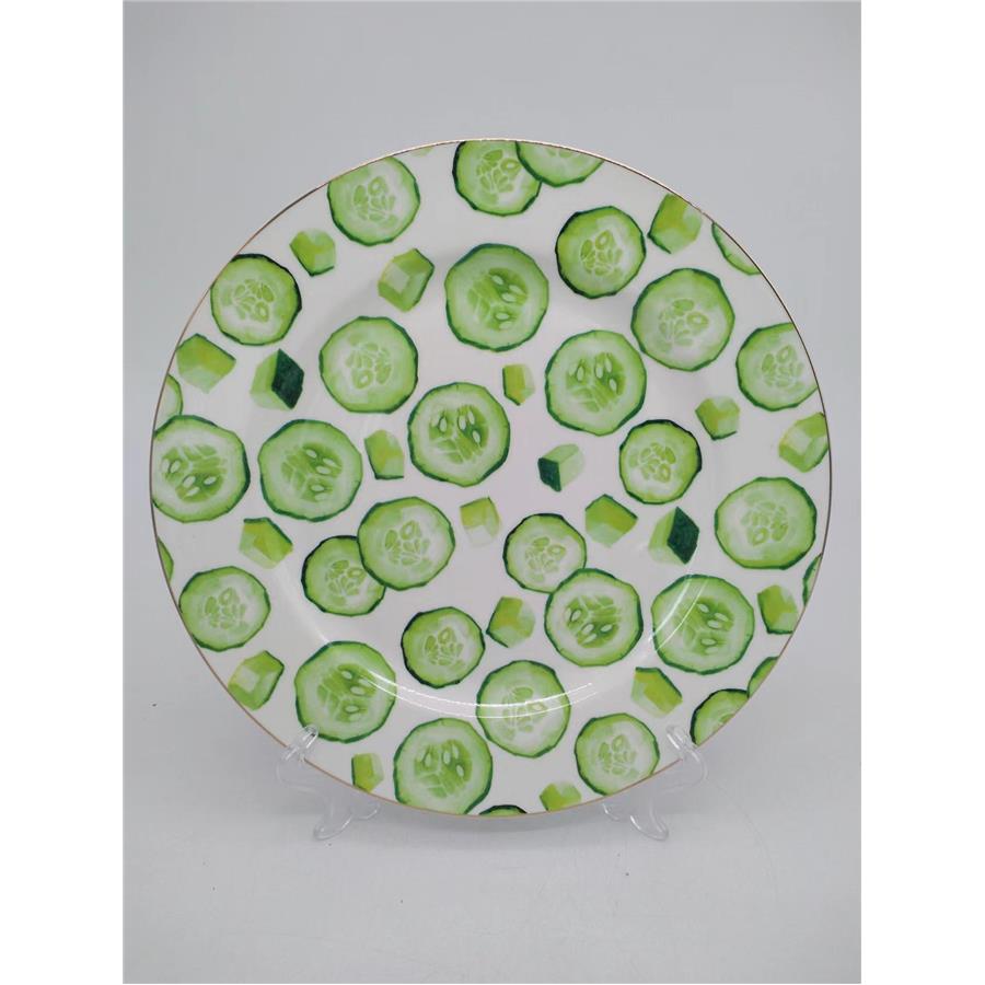 Plato que evoca una sensación de frescura y ligereza con su moderno diseño de pepinos. El uso del verde vibrante lo hace ideal para ensaladas y platillos ligeros, aportando un estilo limpio y natural a tu mesa. Fabricado en cerámica. Medidas: 27 cm (diámetro).