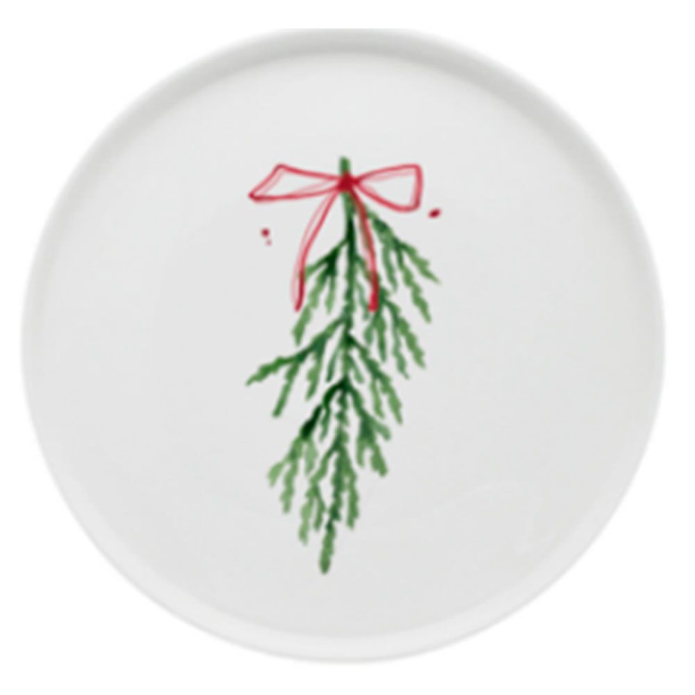 Plato de cerámica estampado hoja de pino navideño con moño de 21cm