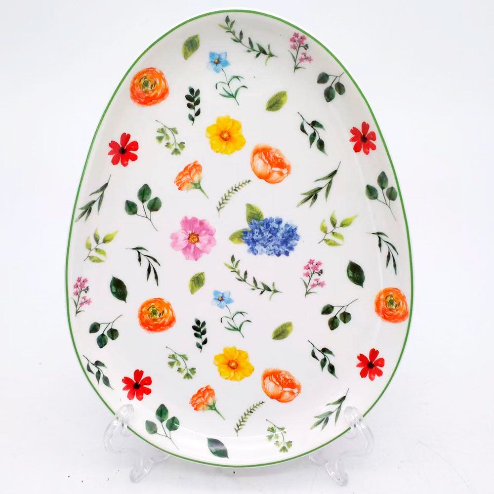 Plato oval que evoca la delicadeza y frescura de un jardín primaveral. Su hermoso estampado de flores lo convierte en una pieza romántica y decorativa. Fabricado en cerámica, es perfecto para servir aperitivos o postres con un estilo vintage encantador. Medidas: 20.5 cm (largo).