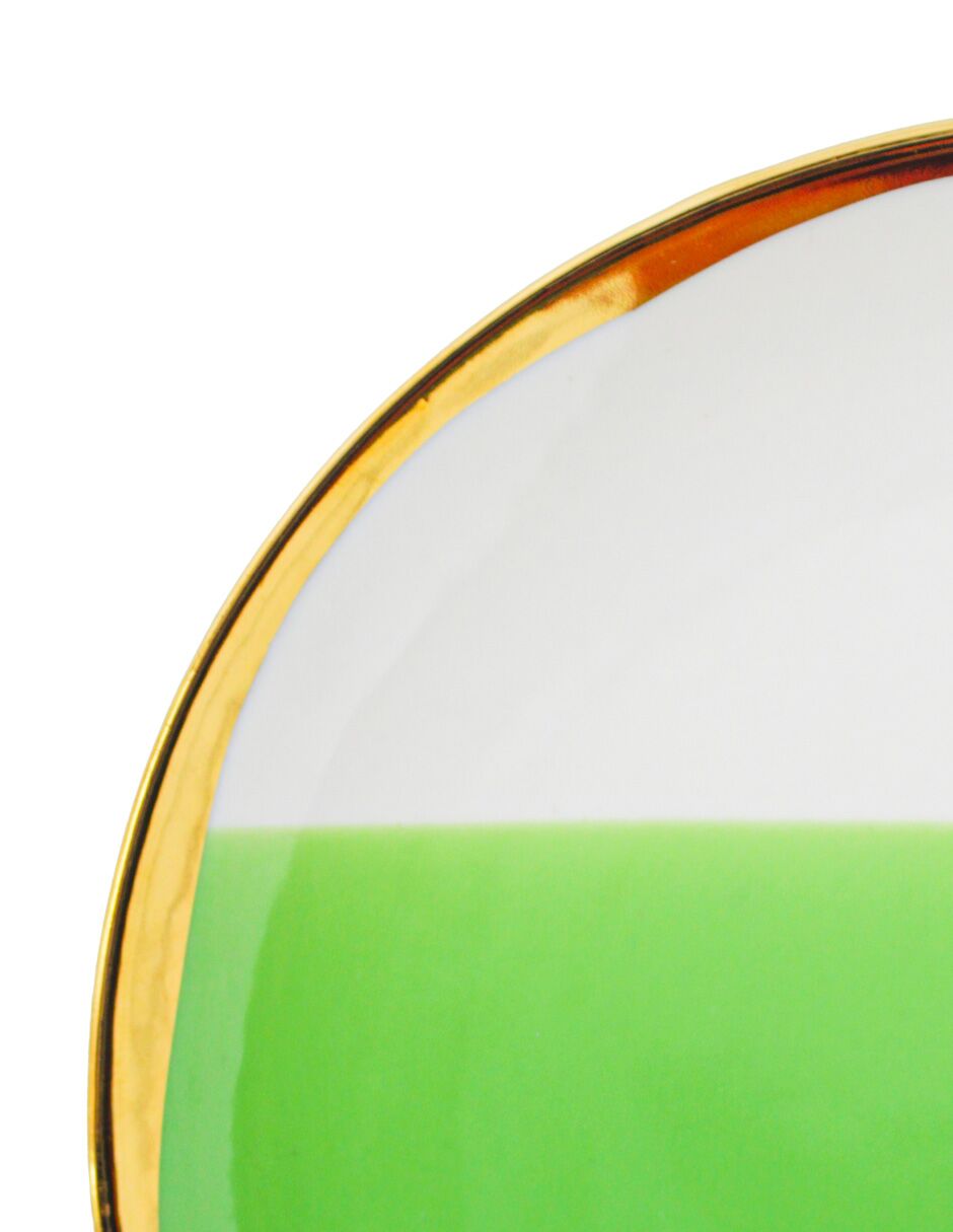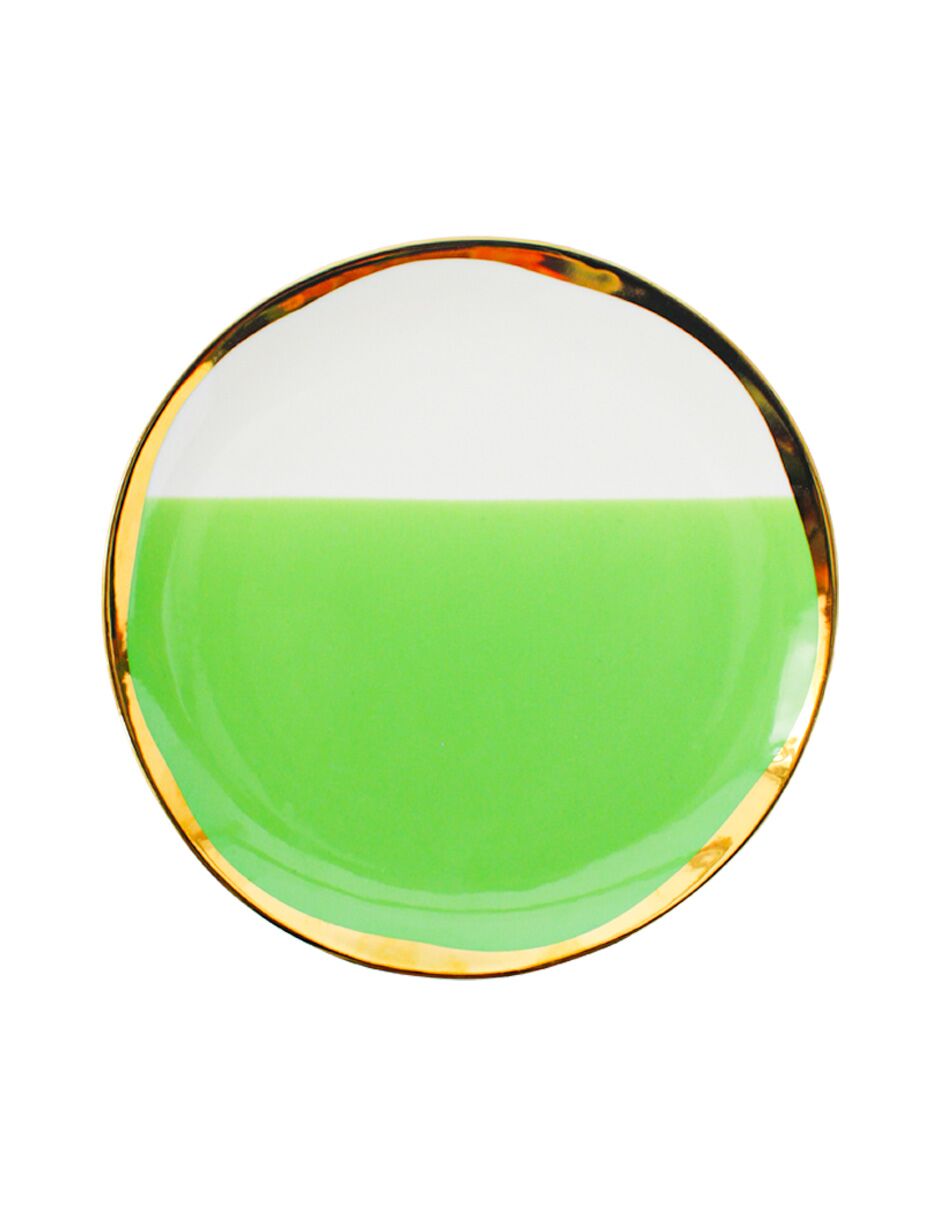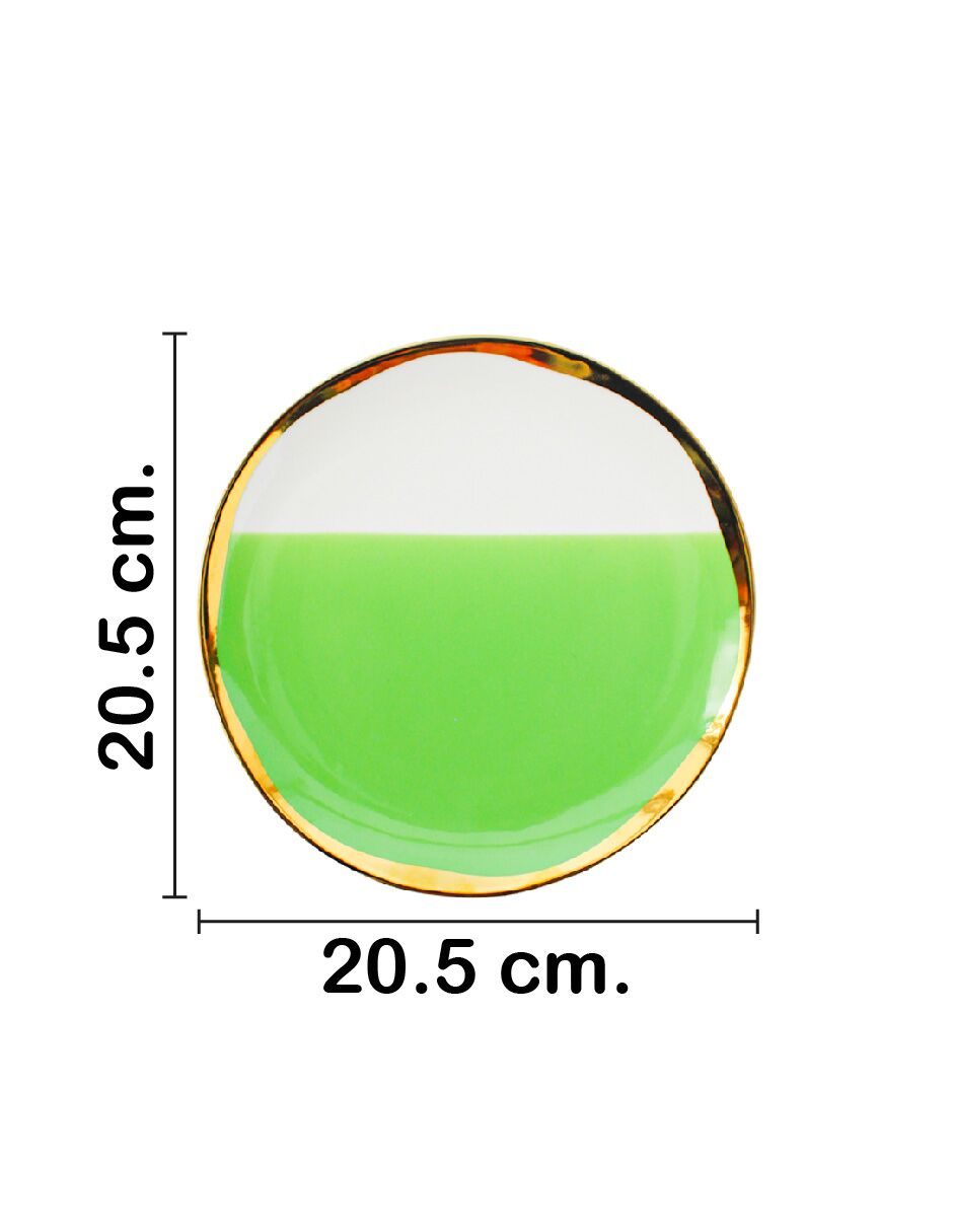 Sirve tus platillos con un toque de sofisticación y estilo con este plato de cerámica. Su diseño en verde y blanco con una orilla dorada te hará sentir el lujo y la tranquilidad. Con medidas de 20.5×20.5×2 cm, es ideal para servir postres, aperitivos o platos pequeños.