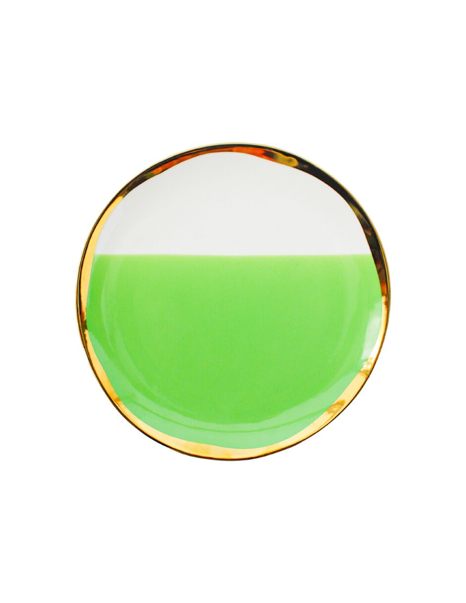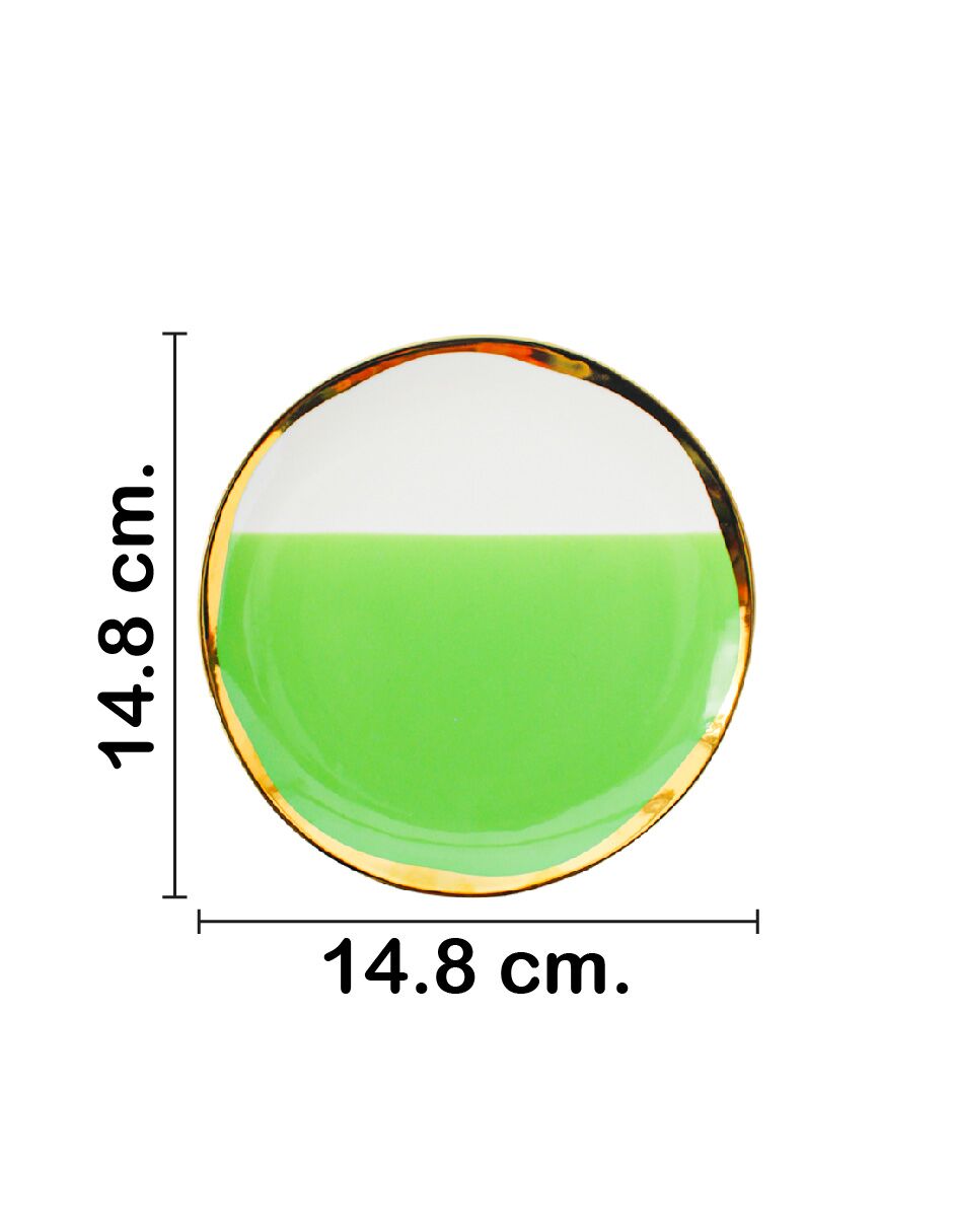 Sirve tus platillos con un toque de sofisticación y estilo con este plato de cerámica. Su diseño en verde y blanco con una orilla dorada te hará sentir el lujo y la tranquilidad. Con medidas de 16 cm, es ideal para servir postres, aperitivos o platos pequeños.
