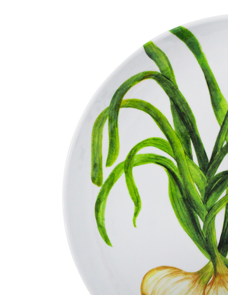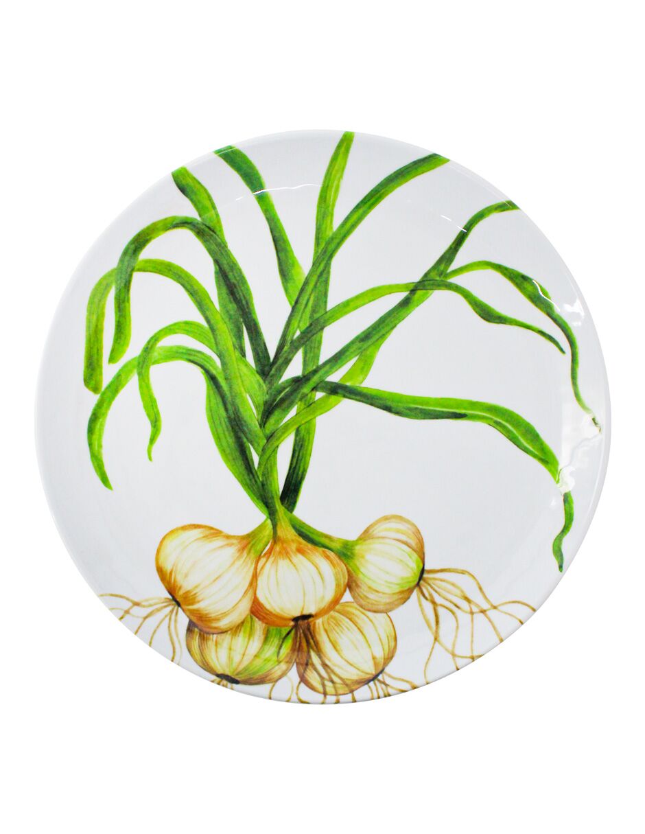 Este cautivador plato de servicio irradia frescura, diseño orgánico y un toque de vitalidad campirana. Su estampado de cebollines crea un patrón visual alegre y natural, perfecto para resaltar la frescura de tus ensaladas o platillos ligeros. Es ideal para servir platos fuertes o centrales con un estilo moderno y audaz que celebra lo natural. Material: Melamina. Medidas: 27.6 x 27.6 x 2.2 cm.
