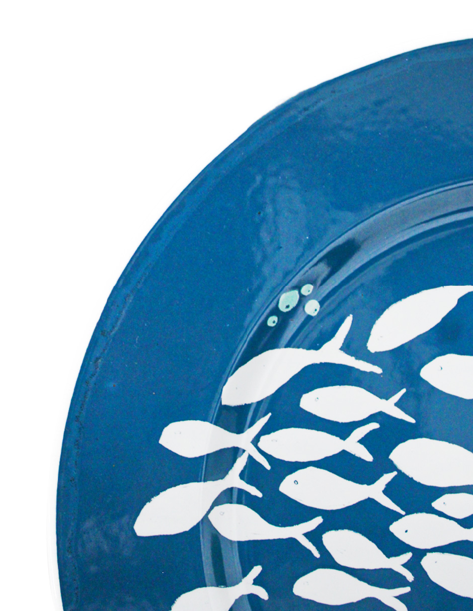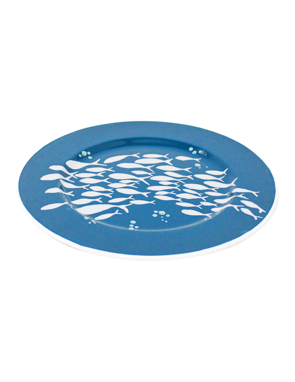 Sirve tus platillos con un toque marino. Este plato de peltre azul con peces es perfecto para tu mesa. Su diseño te hará sentir la frescura y la tranquilidad del mar. Mide 34x34x1.5cm.