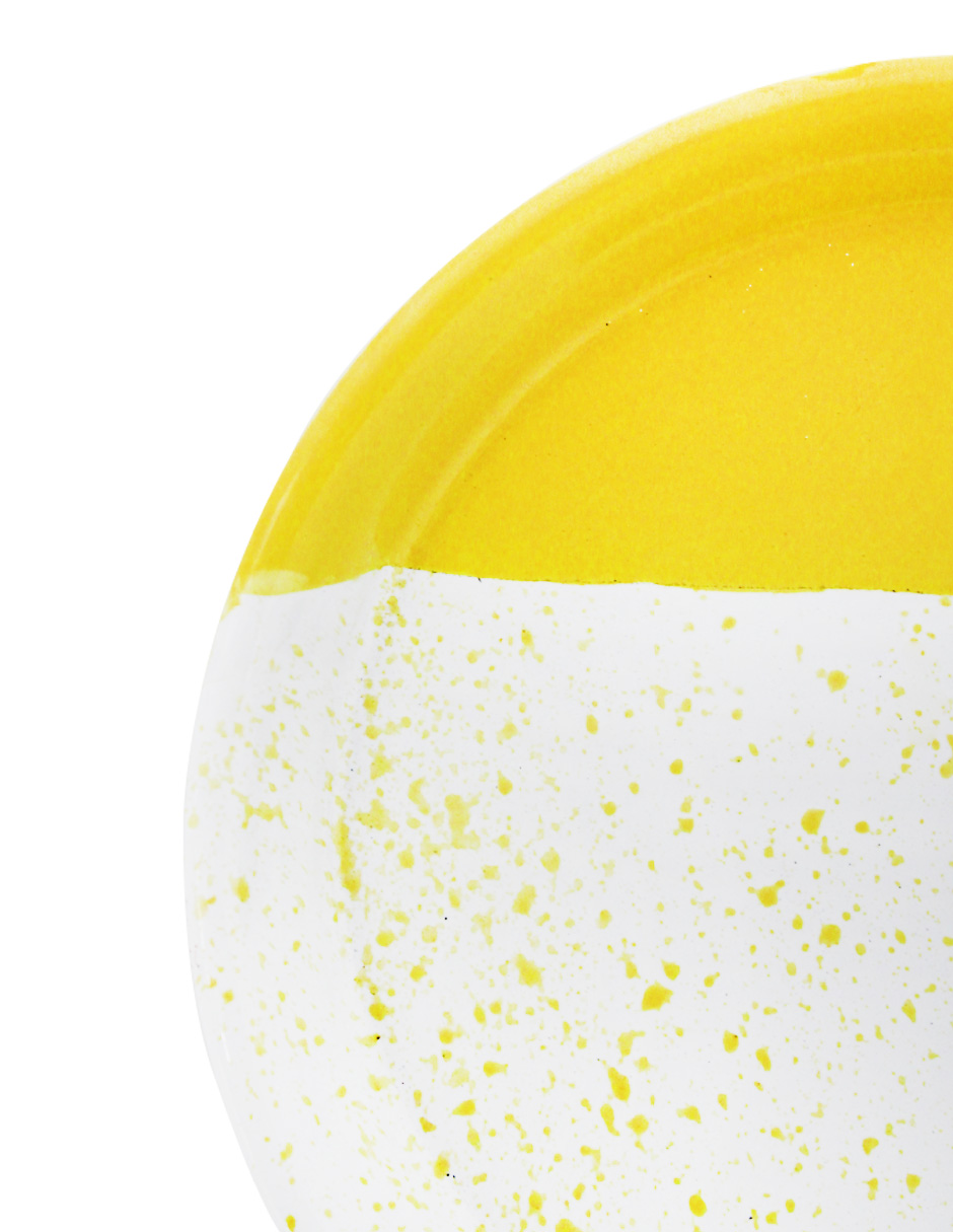 Sirve tus platillos con un toque moderno y alegre. Este plato de peltre amarillo con blanco y puntos es perfecto para tu mesa. Su diseño te hará sentir la alegría y la diversión. Mide 16x16x1.5cm.