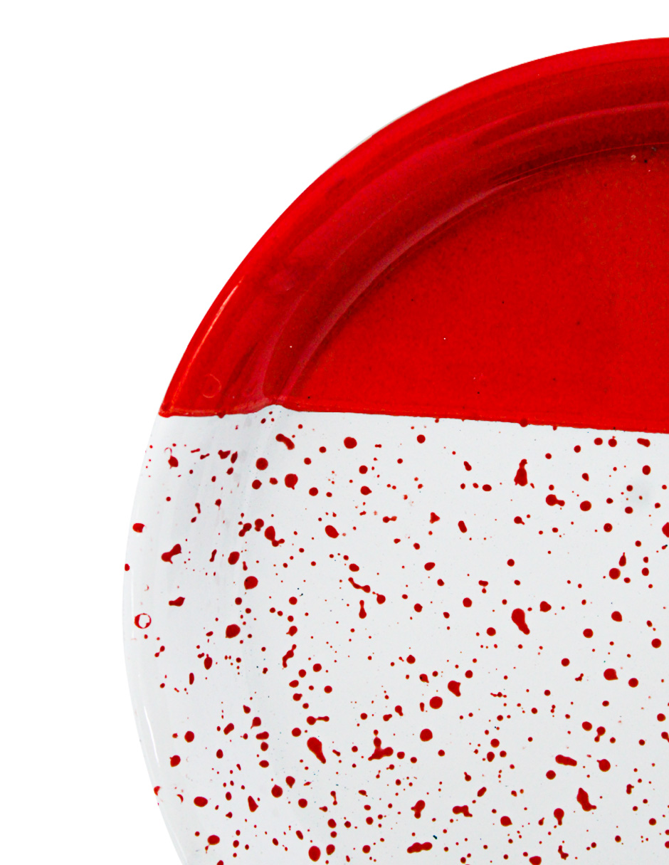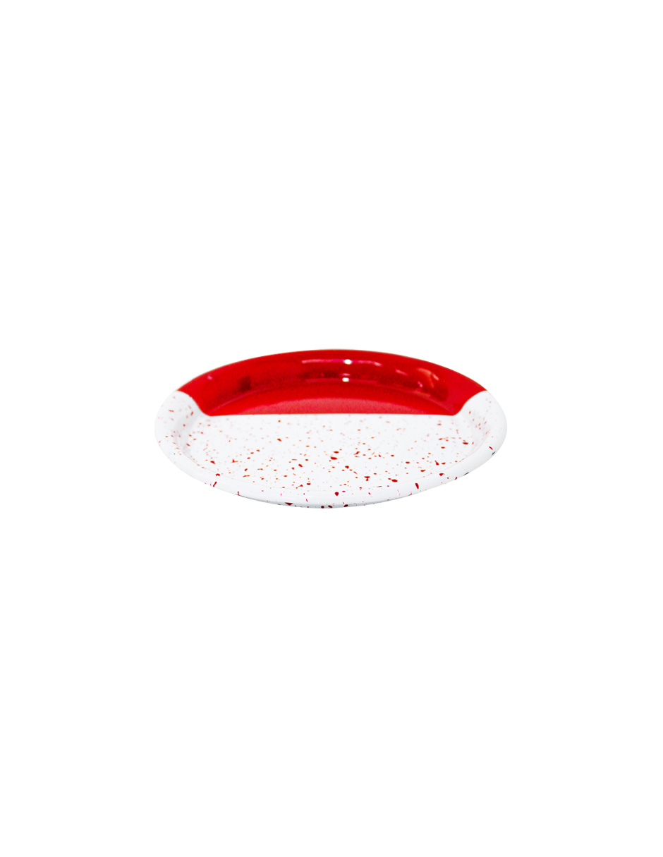 Sirve tus platillos con un toque moderno y alegre. Este plato de peltre rojo con blanco y puntos es perfecto para tu mesa. Su diseño te hará sentir la alegría y la diversión. Mide 16x16x1.5cm.