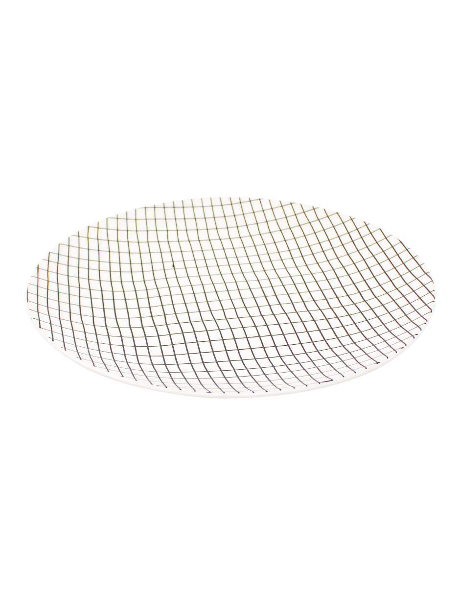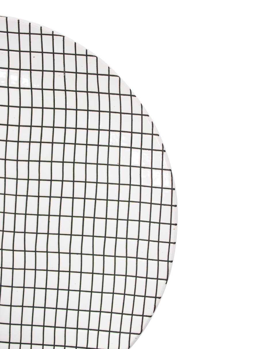 Un plato de porcelana en color blanco con líneas negras. Su diseño minimalista y su combinación de colores clásico lo hacen perfecto para una mesa elegante y contemporánea. Mide 26.8×26.8×2.9cm.