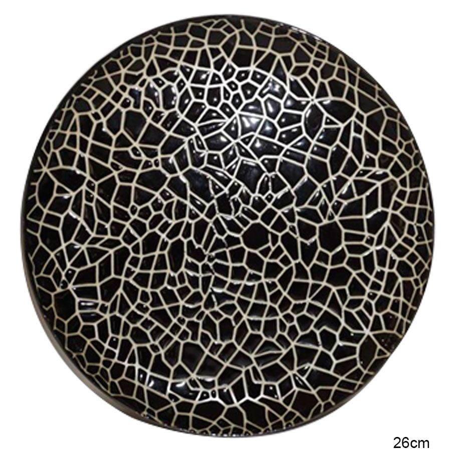 El Plato Negro Craquelado con Blanco es la pieza maestra para quien busca una estética vanguardista, un diseño con textura visual compleja y una presencia imponente en su servicio de mesa. Este objeto ofrece una sofisticación contemporánea incomparable para cualquier cena de autor, evento de gala o como base decorativa en tu espacio de convivencia. Su sola presencia ayuda a elevar el carácter artístico de tu vajilla de manera inmediata. Lo logra mediante su diseño detallado de red irregular o “craquelado” blanco sobre un fondo negro profundo, creando un patrón de mosaico orgánico que evoca la estructura de los fractales naturales en la categoría de Liquidación.