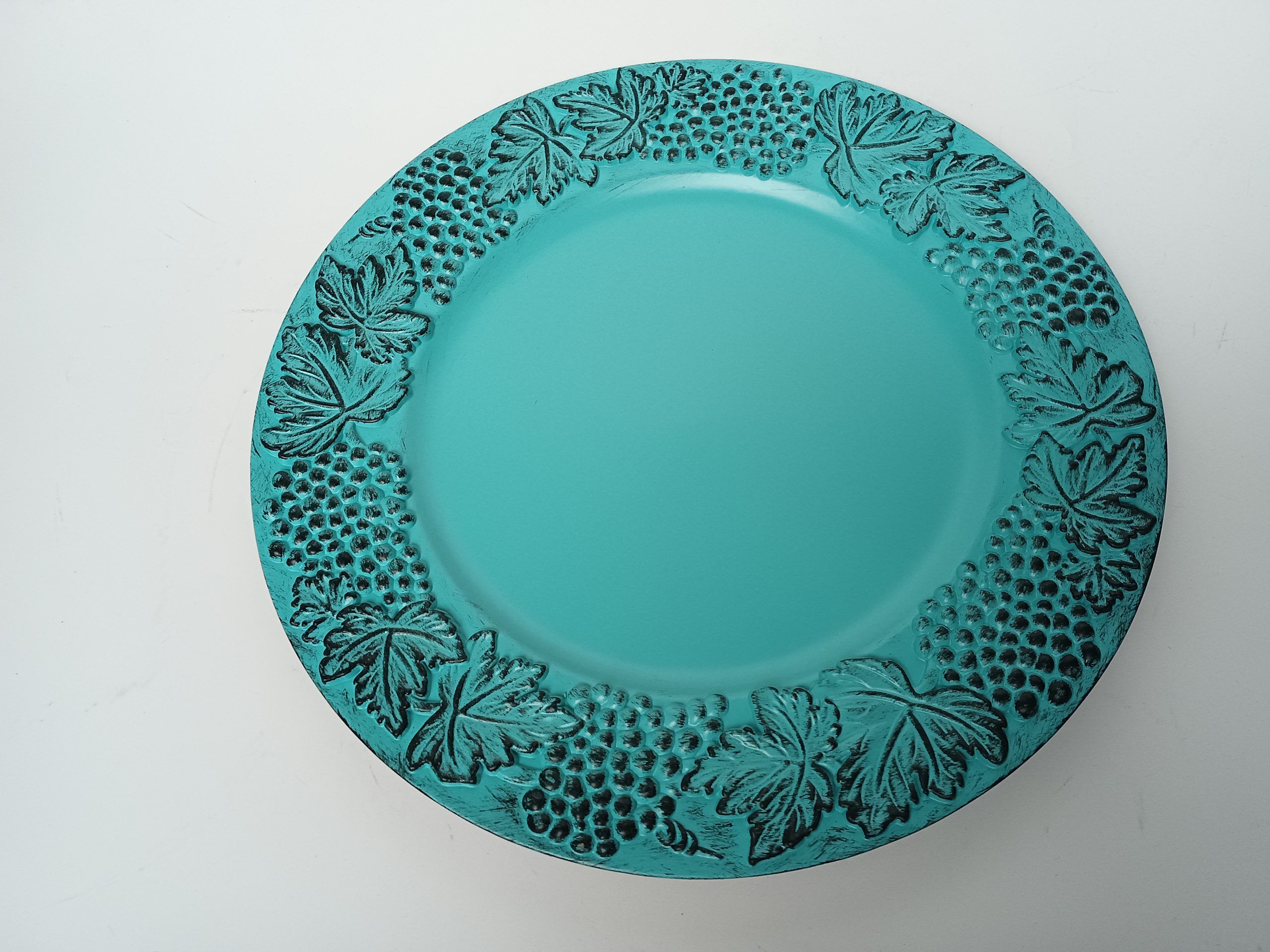 Este cautivador plato de presentación irradia vitalidad exótica y un diseño artístico. Su tono azul turquesa y el diseño de uvas matizadas de negro crean un patrón visual rico y sorprendente. Fabricado en plástico, es la base ideal para ambientes temáticos y llenos de color. Material: Plástico. Medidas: 36 x 36 x 2 cm.