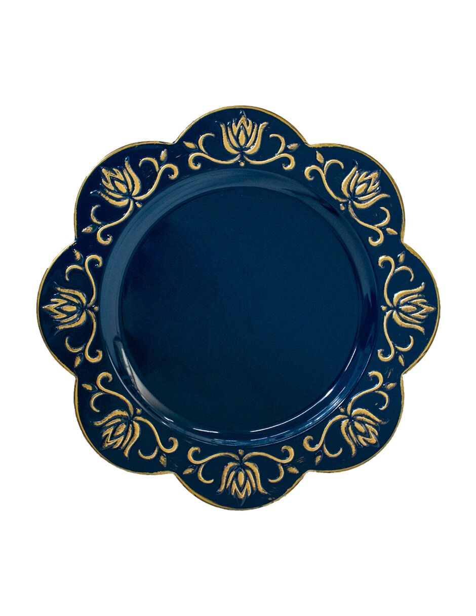 Este distinguido plato de presentación irradia elegancia náutica y lujo profundo. Su color azul marino y el diseño de flor con orilla dorada ofrecen una combinación clásica y opulenta. Fabricado en plástico, es la base ideal para crear un ambiente formal y memorable. Material: Plástico. Medidas: 33 x 33 x 2 cm.
