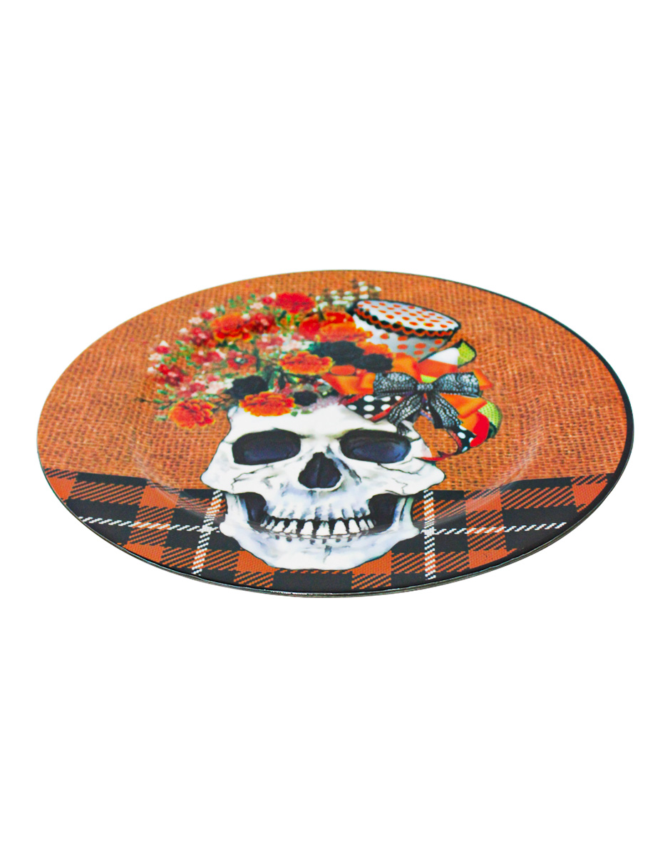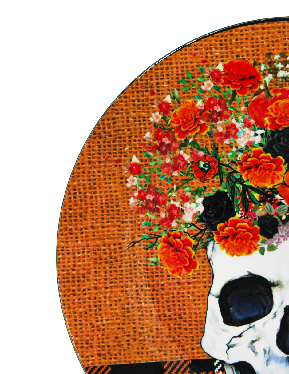 Un plato de presentación naranja con un diseño de calavera adornada con flor de cempasúchil. Es una pieza única y festiva, ideal para la decoración del Día de Muertos. Mide 33cm.