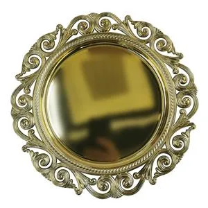 Un plato de presentación dorado brilloso con un elegante diseño de grecas. Su acabado brillante y su patrón clásico lo convierten en una pieza de lujo para tu mesa. Mide 33cm.