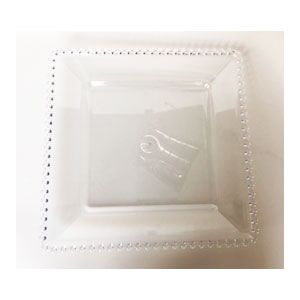 Plato de presentaciòn cuadrado transparente con bolitas plata en las orillas de 32 x32 x3cm