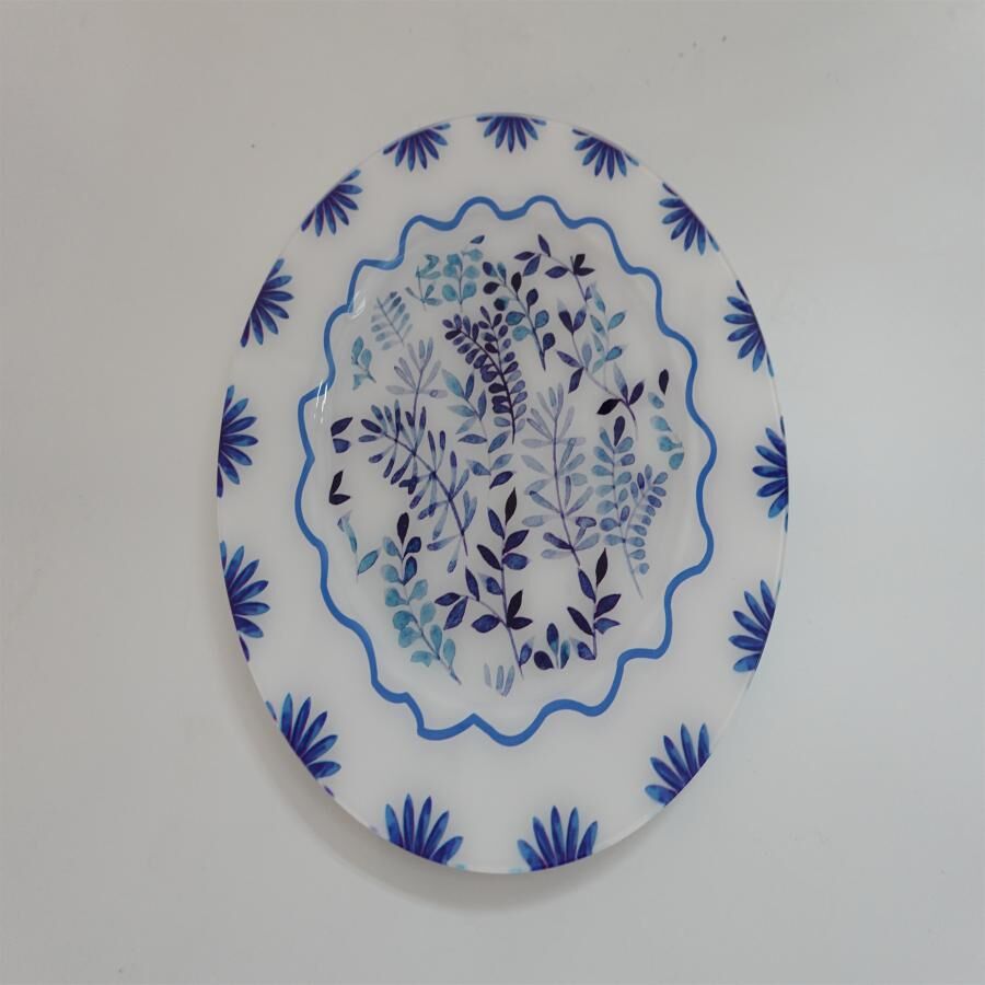 Eleva el arte de tu mesa con la calma de la naturaleza y un toque artístico con este distinguido plato base o de presentación. Su diseño con un patrón de hojas en suave efecto acuarela en tono azul crea un acento visual sereno y elegante, ideal para cualquier comida o reunión. Es la base perfecta para inyectar frescura, distinción y un toque de arte moderno a tus vajillas, evocando la delicadeza de una pintura. Material: Plástico. Medidas: 33 x 33 x 2 cm.