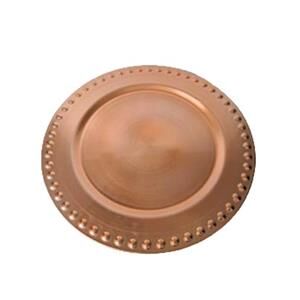 Eleva el arte de tu mesa a un nivel de máximo glamour y opulencia con este impresionante plato base o de presentación. Su acabado en un cálido y moderno tono cobre metálico ofrece un brillo sofisticado, realzado por un delicado borde con relieve perlado, creando una pieza de máxima distinción y lujo. Es la base perfecta para infundir calidez, elegancia y un toque chic atemporal a tus vajillas, ideal para celebraciones que buscan un ambiente memorable y refinado. Material: Plástico. Medidas: 33 cm de diámetro.