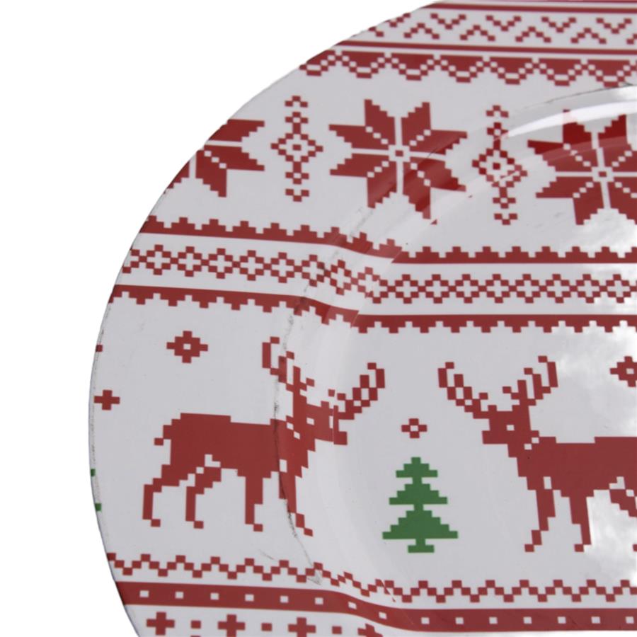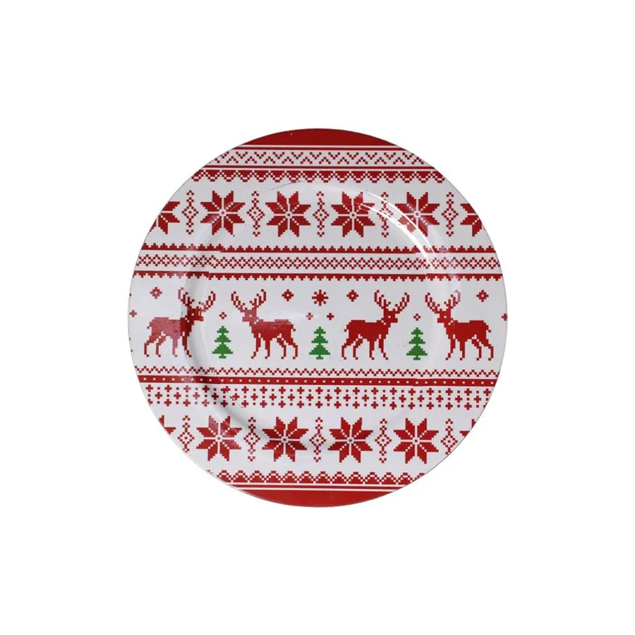 Envuelve tu mesa en la tradición artesanal y la calidez rústica de la Navidad con este encantador plato de presentación, que presenta un diseño de renos rojos simulando un delicado bordado. Su patrón detallado y hogareño es ideal para realzar tus platillos, inyectando una sensación de comodidad, nostalgia y espíritu festivo clásico. Es el toque perfecto para crear una atmósfera navideña auténtica y acogedora. Material: Plástico. Medidas: 33 cm de diámetro.