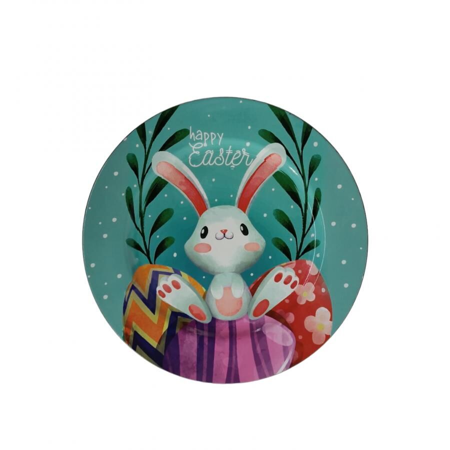 Un plato de presentación con un diseño de conejo de Pascua, ideal para añadir un toque divertido y festivo a tus celebraciones de temporada. Mide 33cm.