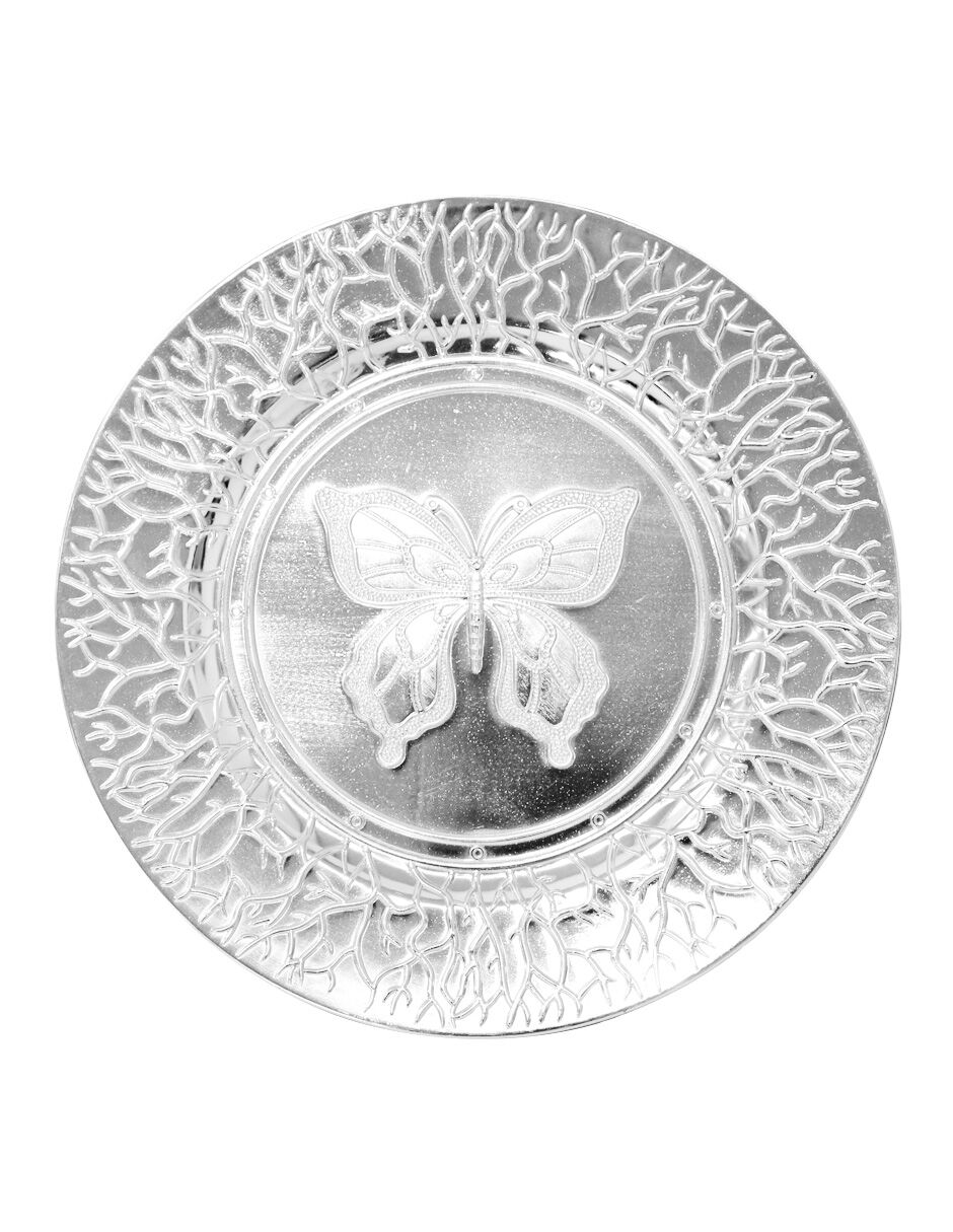 Este encantador plato de presentación irradia elegancia, brillo y un toque natural. Su acabado plateado y el delicado diseño de mariposa crean un punto focal de distinción. Fabricado en plástico, es la base ideal para un ambiente sofisticado y lleno de vida. Material: Plástico. Medidas: 33 cm (diámetro).